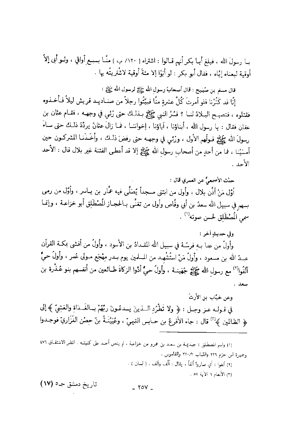وأول من عدا به فرسه في سبيل الله المقداد بن الأسود، وأول من أفشى بمكة القرآن عبد الله بن مسعود، وأول من استشهد من المسلمين يوم بدر مهجع مولى عمر، وأول حيٍّ آلفوا مع رسول الله صَلَّى اللهُ عَلَيْهِ وَسَلَّمَ جهينة، وأول حيٍّ أدوا الزكاة طائعين من أنفسهم بنو عذرة بن سعد.