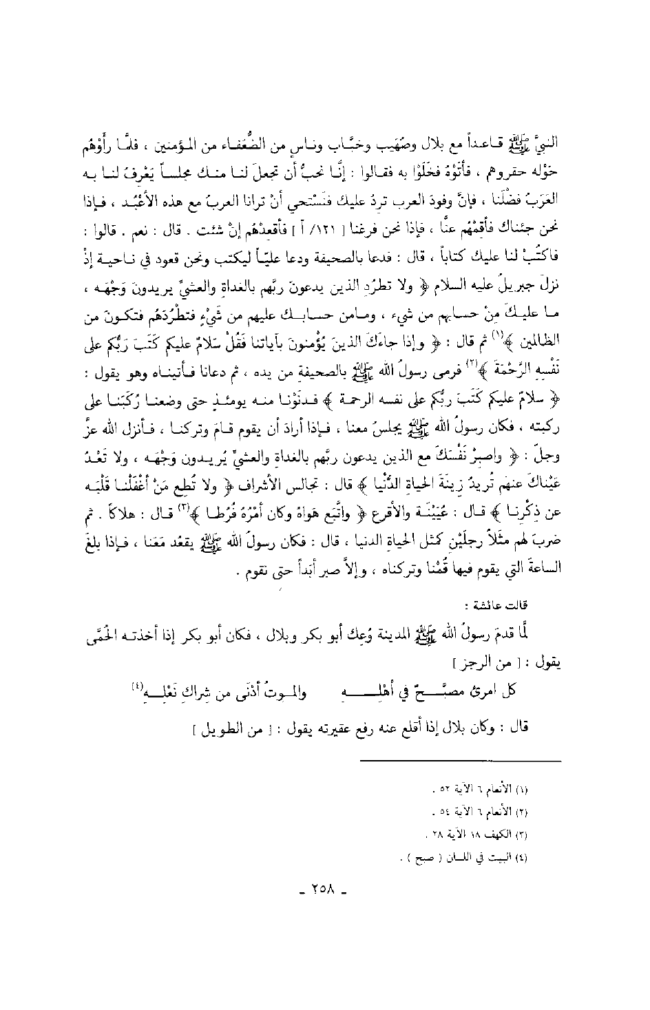 قالوا: فاكتب لنا عليك كتاباً، قال: فدعا بالصحيفة ودعا علياً ليكتب ونحن قعود في ناحية إذ نزل جبريل عليه السلام " ولا تطرد الذين يدعون ربهم بالغداة والعشي يريدون وجهه، ما عليك من حسابهم من شيء، وما من حسابك عليهم من شيءٍ فتطردهم فتكون من الظالمين " ثم قال: " وإذا جاءك الذين يؤمنون بآياتنا فقل سلامٌ عليكم كتب ربكم على نفسه الرحمة " فرمى رسول الله صَلَّى اللهُ عَلَيْهِ وَسَلَّمَ بالصحيفة من يده، ثم دعانا فأتيناه وهو يقول: " سلامٌ عليكم كتب ربكم على نفسه الرحمة " فدنونا منه يومئذٍ حتى وضعنا ركبنا على ركبته، فكان رسول الله صَلَّى اللهُ عَلَيْهِ وَسَلَّمَ يجلس معنا، فإذا أراد يقوم قام وتركنا، فأنزل الله عز وجل: " واصبر نفسك مع الذين يدعون ربهم بالغداة والعشي يريدون وجهه ولا تعد عيناك عنهم تريد زينة الحياة الدنيا " قال: تجالس الأشراف " ولا تطع من أغفلنا قلبه عن ذكرنا " قال: عيينة والأقرع " واتبع هواه وكان أمره فرطا " قال: هلاكاً.