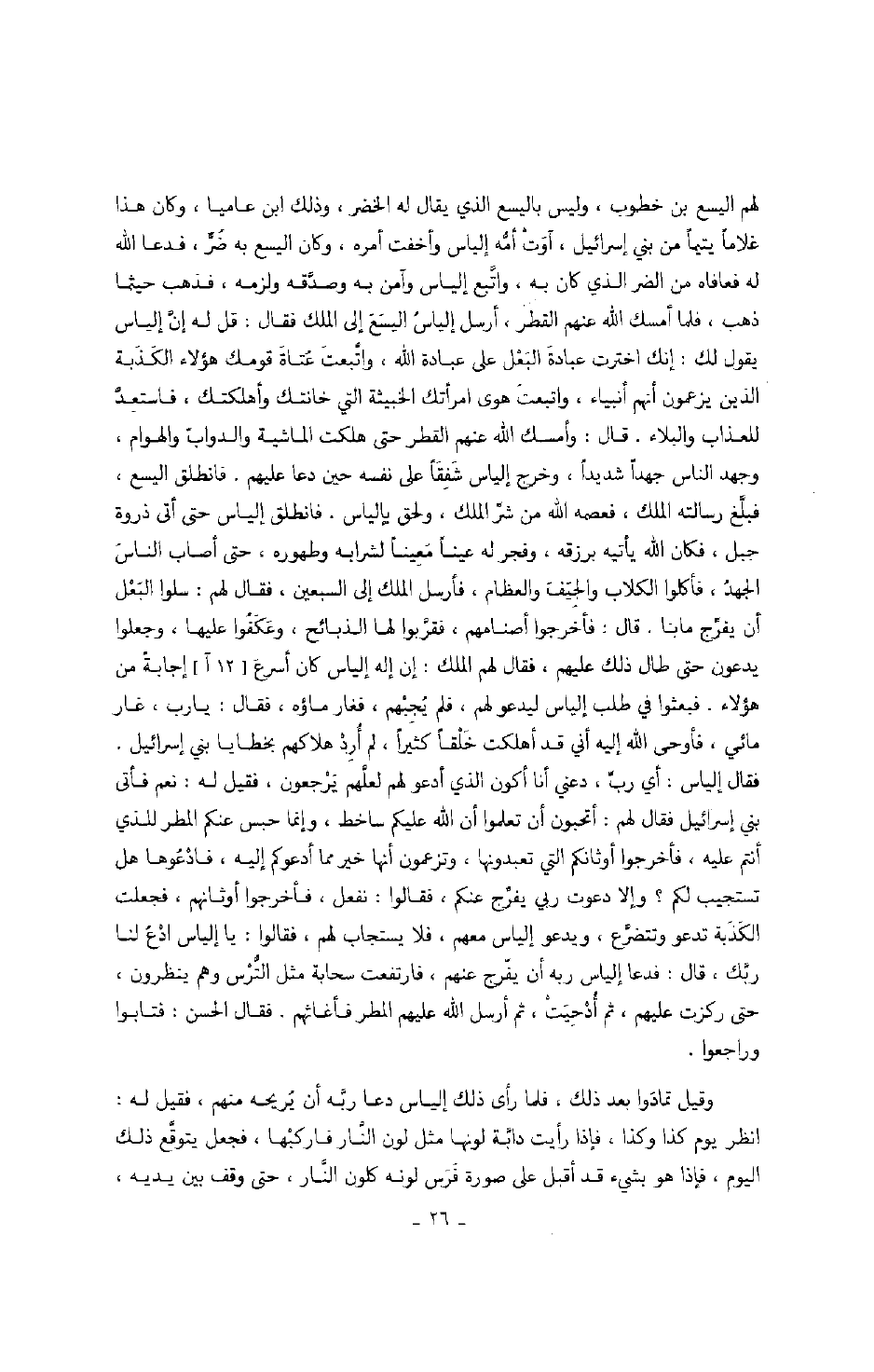 لهم اليسع بن خطوب، وليس باليسع الذي يقال له الخضر، وذلك ابن عاميا، وكان هذا غلاماً يتيماً من بني إسرائيل، آوت أمه إلياس وأخفت أمره، وكان اليسع به ضرٌّ، فدعا الله له فعافاه من الضر الذي كان به، واتبع إلياس وآمن به وصدقه ولزمه، فذهب حيثما ذهب، فلما أمسك الله عنهم القطر، أرسل إلياس اليسع إلى الملك فقال: قل له إن إلياس يقول لك: إنك اخترت عبادة البعل على عبادة الله، واتبعت عتاة قومك هؤلاء الكذبة الذين يزعمون أنهم أنبياء، واتبعت هوى امرأتك الخبيثة التي خانتك وأهلكتك، فاستعد للعذاب والبلاء.