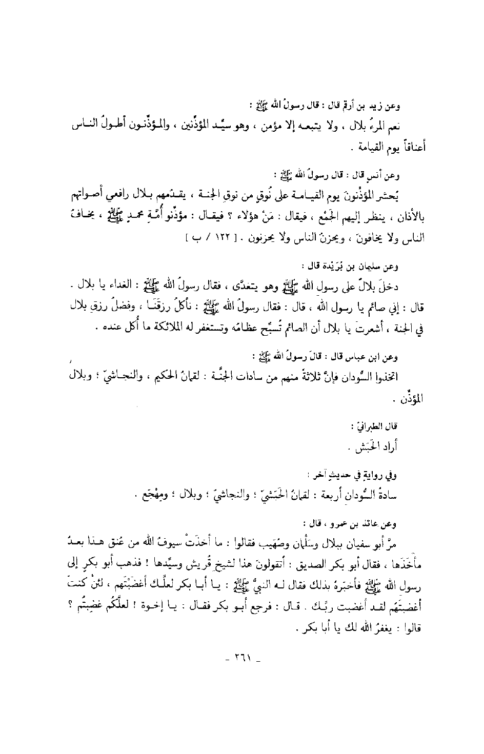 وعن زيد بن أرقم قال: قال رسول الله صَلَّى اللهُ عَلَيْهِ وَسَلَّمَ: " نعم المرء بلال، ولا يتبعه إلا مؤمن، وهو سيد المؤذنين، والمؤذنون أطول الناس أعناقاً يوم القيامة ".