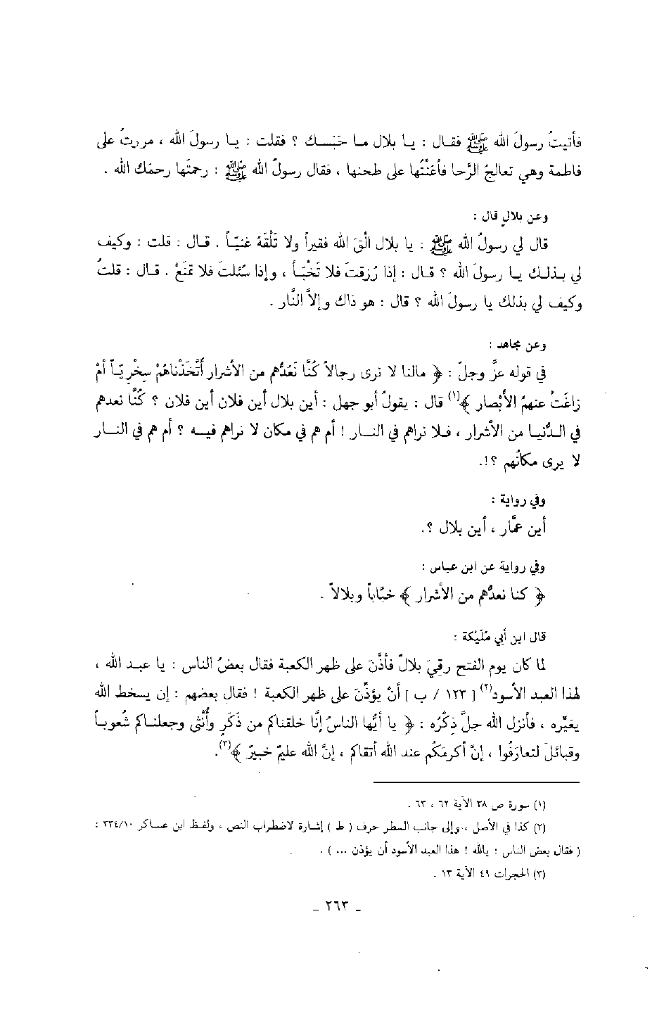 وعن مجاهد: في وقله عز وجل: " ما لنا لا نرى رجالاً كنا نعدهم من الأشرار أتخذناهم سخرياً أم زاغت عنهم الأبصار " قال: يقول أبو جهل: أين بلال أين فلان أين فلان؟ كنا نعدهم في الدنيا من الأشرار، فلا نراهم في النار! أم هم في مكان لا نراهم فيه؟ أم هم في النار لا يرى مكانهم؟!.