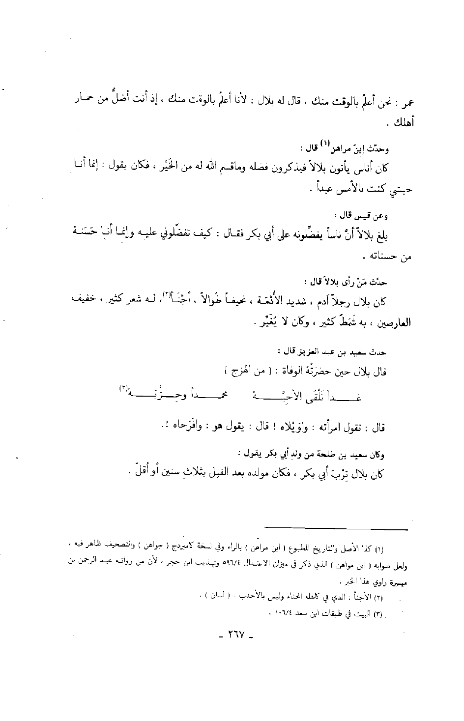 وحدث ابن مراهن قال: كان أناس يأتون بلالاً فيذكرون فضله وما قسم الله له من الخير، فكان يقول: إنما أنا حبشي كنت بالأمس عبداً.