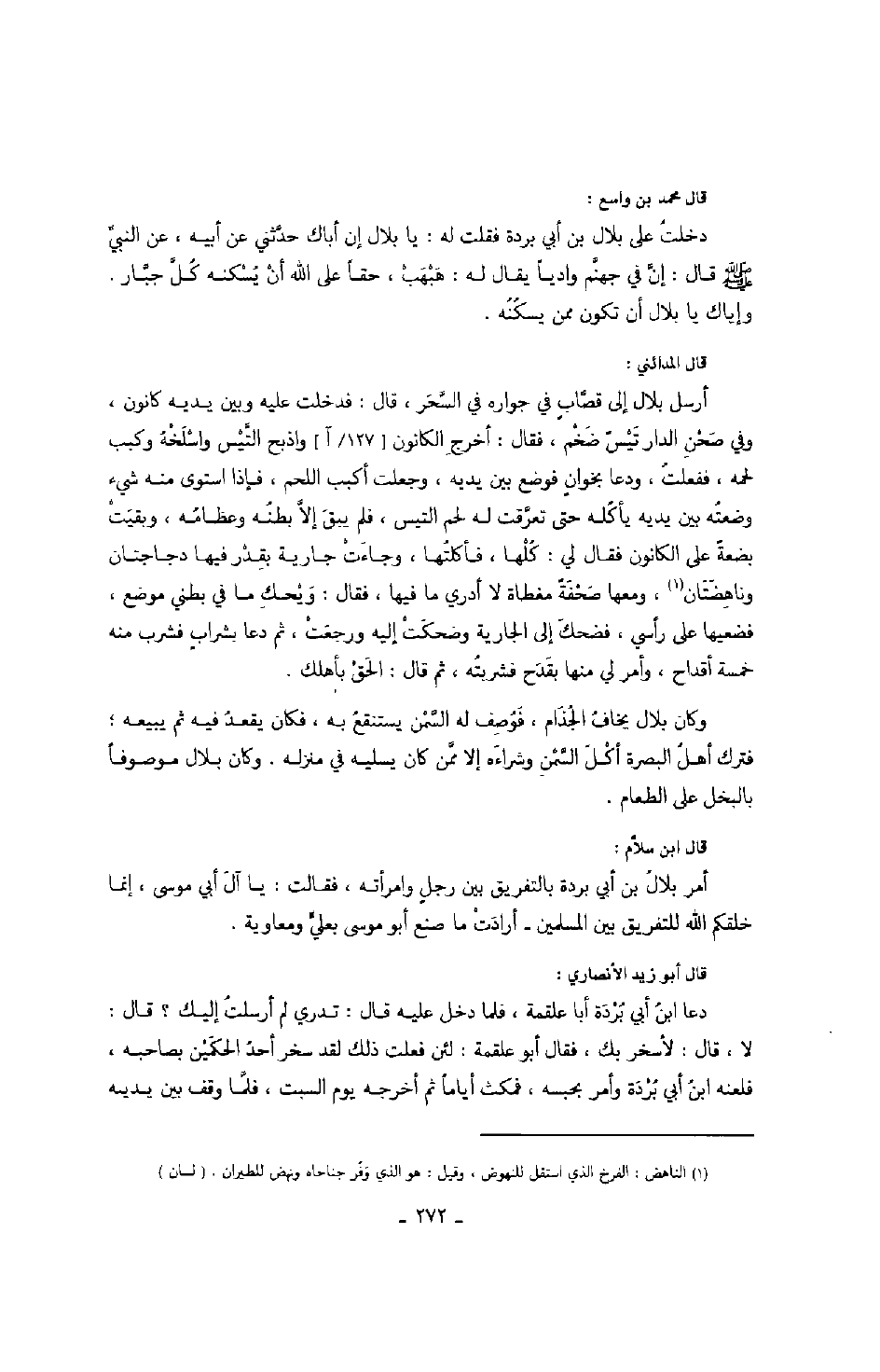 قال المدائني: أرسل بلال إلى قصابٍ في جواره في السحر، قال: فدخلت عليه وبين يديه كانون، وفي صحن الدار تيسٌ ضخم، فقال: أخرج الكانون واذبح التيس واسلخه وكبب لحمه، ففعلت، ودعا بخوانٍ فوضع بين يديه، وجعلت أكبب اللحم، فإذا استوى منه شيء وضعته بين يديه يأكله حتى تعرقت له لحم التيس، فلم يبق إلا بطنه وعظامه، وبقيت بضعةٌ على الكانون فقال لي: كلها، فأكلتها، وجاءت جارية بقدر فيها دجاجتان وناهضتان، ومعه صحفةٌ مغطاة لا أدري ما فيها، فقال: ويحك ما في بطني موضع، فضعيها على رأسي، فضحك إلى الجارية وضحكت إليه ورجعت، ثم دعا بشرابٍ فشرب منه خمسة أقداح، وأمر لي منها بقدح فشربته، ثم قال: الحق بأهلك.