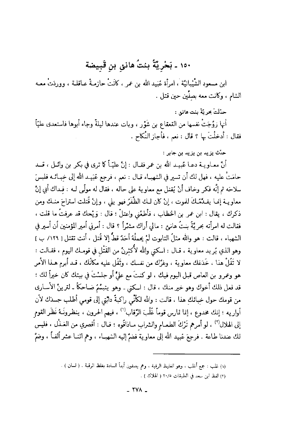 حدث يزيد بن يزيد بن جابر أن معاوية دعا عبيد الله بن عمر فقال: إن علياً كما ترى في بكر بن وائل، قد حامت عليه، فهل لك أن تسير في الشهباء قال: نعم، فرجع عبيد الله إلى خبائه فلبس سلاحه ثم إنه فكر وخاف أن يقتل مع معاوية على حاله، فقال له مولى له: فداك أبي إن معاوية إنما يقدمك للموت، إن كان لك الظفر فهو يلي، وإن قتلت استراح منك ومن ذكرك، يقال: ابن عمر بن الخطاب، فأطعني واعتل؛ قال: ويحك قد عرفت ما قلت، فقالت له امرأته بحرية بنت هانئ: ما لي أراك مشمراً؟ قال: أمرني أمير المؤمنين أن أسير في الشهباء، قالت: هو والله مثل التابوت لم يحمله أحدٌ قطٌّ إلا قتل، أنت تقتل وهو الذي يريد معاوية، قال: اسكتي والله لأكثرن من القتل في قومك اليوم، فقالت: لا تقل هذا، خدعك معاوية، وغرك من نفسك، وثقل عليه مكانك، قد أبرم هذا الأمر هو وعمرو بن العاص قبلاليوم فيك، لو كنت مع عليٍّ أو جلست في بيتك كان خيراً لك؛ قد فعل ذلك أخوك وهو خير منك، قال: اسكتي - وهو يبتسم ضاحكاً - لترينّ الأسارى من قومك حول خبائك هذا، قالت: والله لكأني راكبةٌ دابتي إلى قومي أطلب جسدك لأن أورايه؛ إنك مخدوع، إنما تمارس قوماً غلب الرقاب، فيهم الحرون، ينظرونه نظر القوم إلى الهلال، لو أمرهم ترك الطعام والشراب ما ذاقوه؛ قال: أقصري من العذل، فليس لك عندنا طاعة.