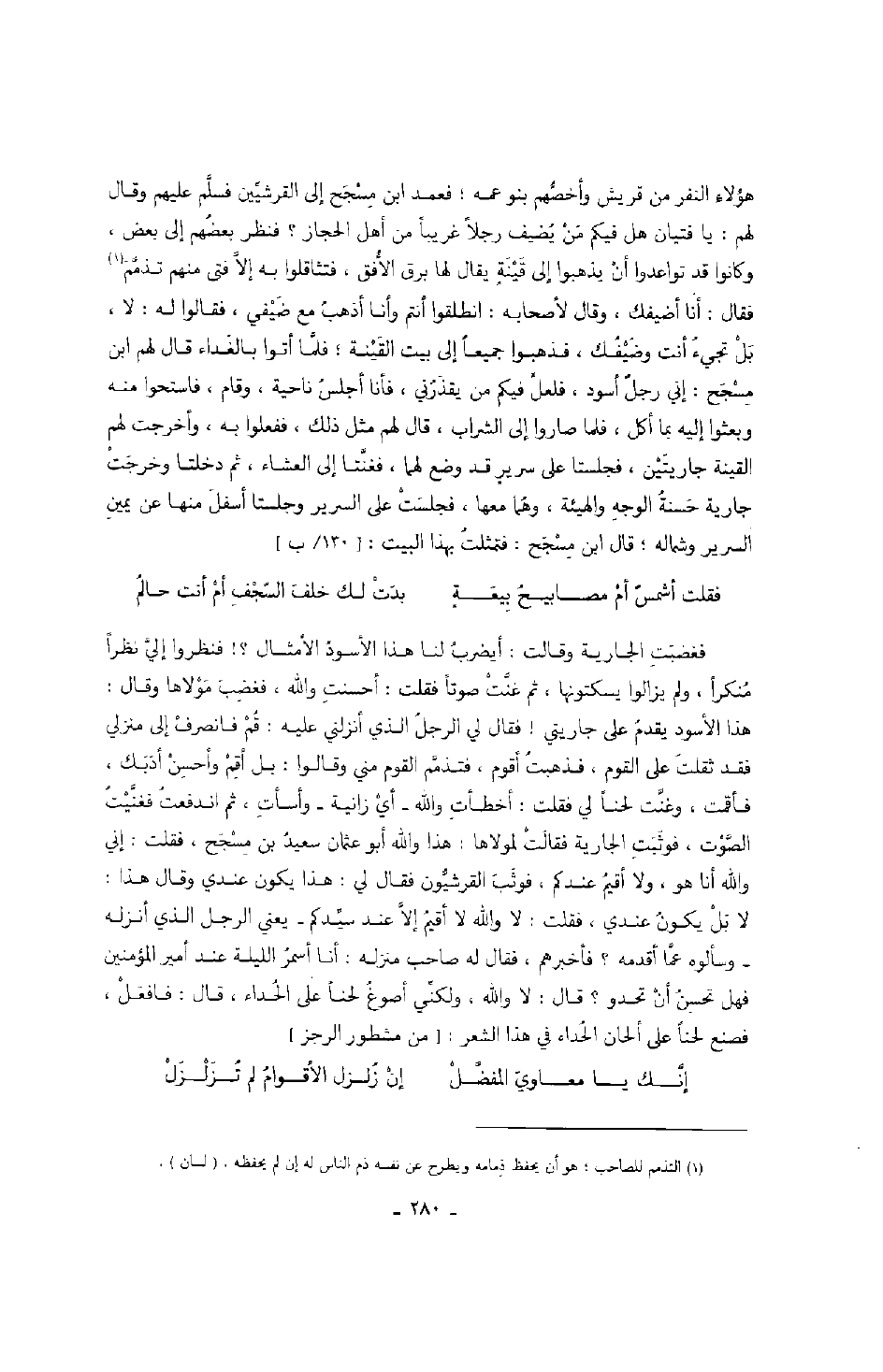 هؤلاء النفر من قريش وأخصهم بنو عمه؛ فعمد ابن مسجح إلى القرشيين فسلم عليهم وقال لهم: يا فتيان هل فيكم من يضيف رجلاً غريباً من أهل الحجاز؟ فنظر بعضهم إلى بعض، وكانوا قد تواعدوا أن يذهبوا إلى قينةٍ يقال لها برق الأفق، فتثاقلوا به إلا فتى منهم تذمم فقال: أنا أضيفك، وقال لأصحابه: انطلقوا أنتم وأنا أذهب مع ضيفي، فقالوا له: لا، بل تجيء أنت وضيفك، فذهبوا جميعاً إلى بيت القينة؛ فلما أتوا بالغداء قال لهم ابن مسجح: إني رجلٌ أسود، فلعل فيكم من يقذرني، فأنا أجلس ناحية، وقام، فاستحوا منه وبعثوا إليه بما أكل، فلما صاروا إلى الشراب، قال لهم مثل ذلك، ففعلوا به، وأخرجت لهم القينة جاريتين، فجلستا على سريرٍ قد وضع لهما، فغنتا إلى العشاء، ثم دخلتا وخرجت جارية حسنة الوجه والهيئة، وهما معها، فجلست على السرير وجلستا أسفل منها عن يمين السرير وشماله؛ قال ابن مسجح: فتمثلت بهذا البيت: