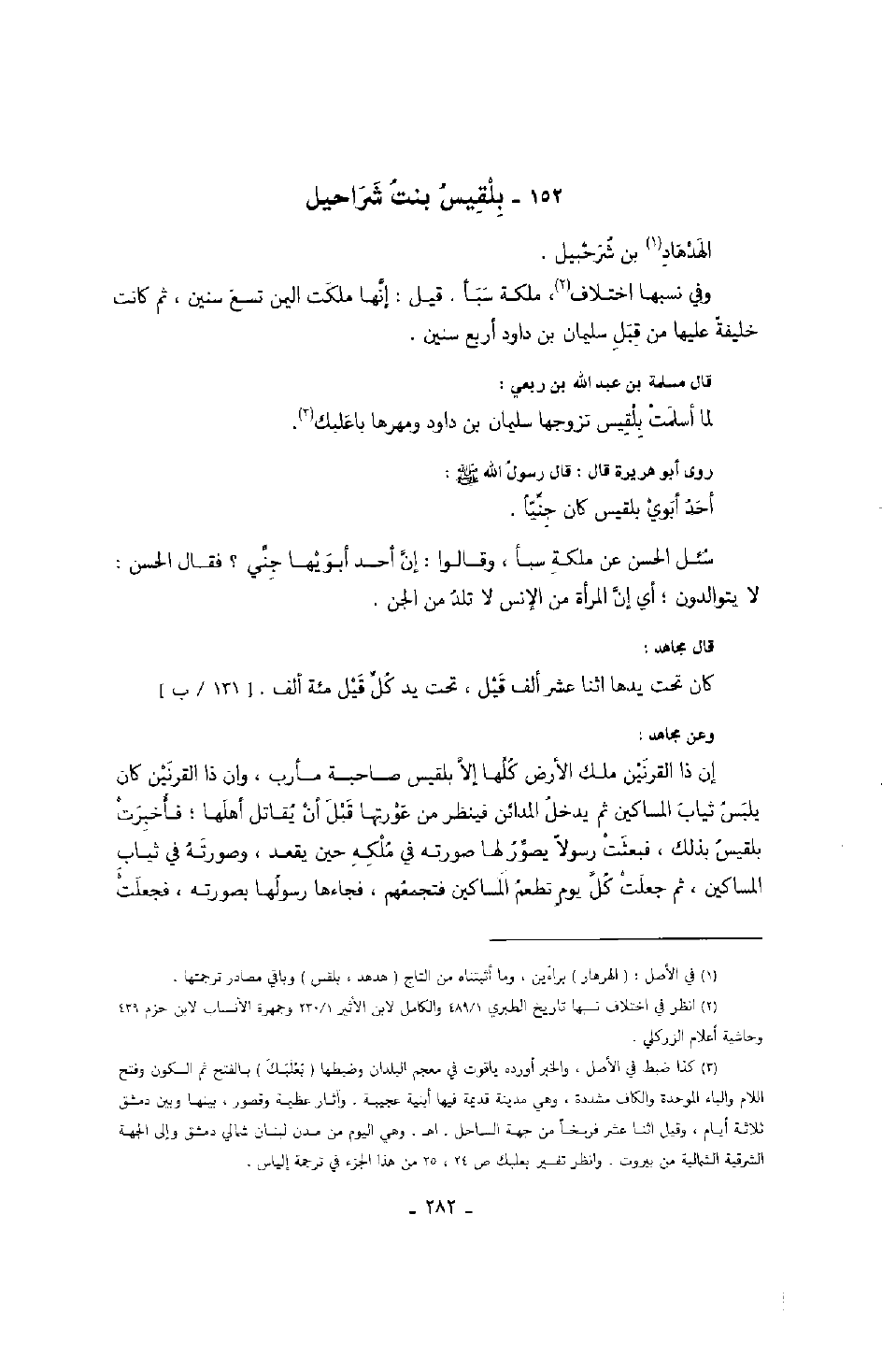 وعن مجاهد: إن ذا القرنين ملك الأرض إلا بلقيس صاحبة مأرب، وإن ذا القرنين كان يلبس ثياب المساكين ثم يدخل المدائن فينظر من عورتها قبل أن يقاتل أهلها؛ فأخبرت بلقيس بذلك، فبعثت رسولاً يصور لها صورته في ملكه حين يقعد، وصورته في ثياب المساكين، ثم جعلت كل يومٍ تطعم المساكين فتجمعهم، فجاءها رسولها بصورته، فجعلت