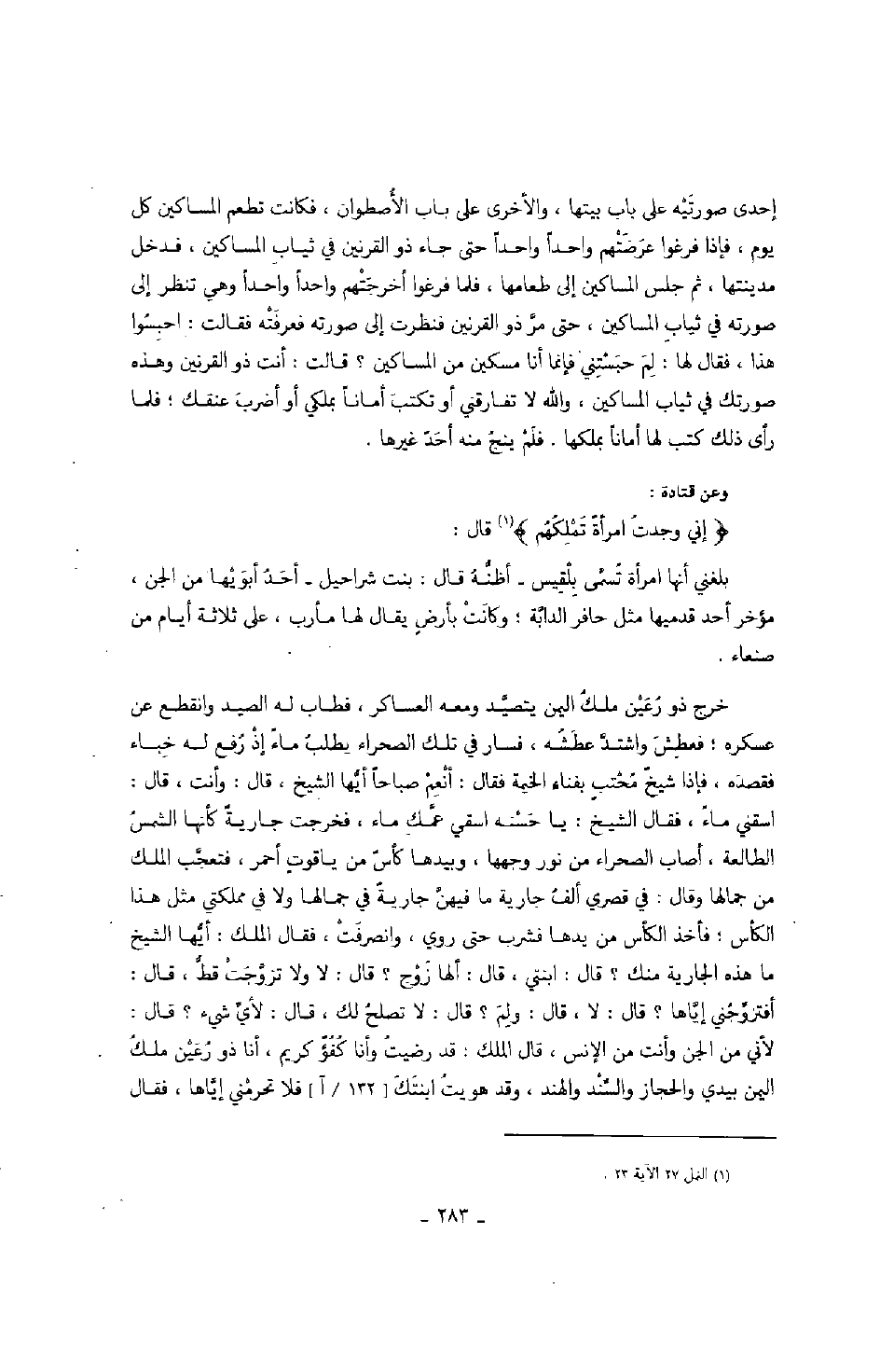 وعن قتادة: " إني وجدت امرأةً تملكهم " قال: بلغني أنها امرأة تسمى بلقيس - أظنه قال: بنت شراحبيل - أحد أبويها من الجن، مؤخر أحد قدميها مثل حافر الدابة؛ وكانت بأرضٍ يقال لها مأرب، على ثلاثة أيام من صنعاء.
