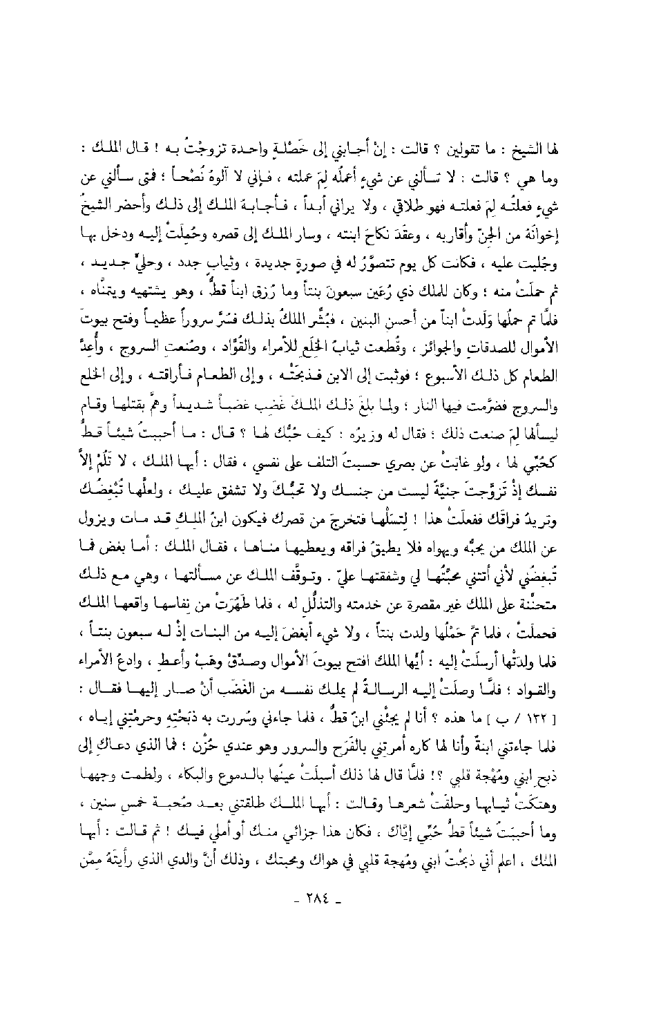وتوقف الملك عن مسألتها، وهي مع ذلك متحننة على الملك غير مقصرة عن خدمته والتذلل له، فلما طهرت من نفاسها واقعها الملك فحملت، فلما تم حملها ولدت بنتاً، ولا شيء أبغض إليه من البنات إذ له سبعون بنتاً، فلما ولدتها أرسلت إليه: أيها الملك افتح بيوت الأموال وصدق وهب وأعط، وادع الأمراء والقواد؛ فلما وصلت إليه الرسالة لم يملك نفسه من الغضب أن صار إليها فقال: ما هذه؟ أنا لم يجئني ابنٌ قط، فلما جاءني سررت به ذبحته وحرمتني إياه، فلما جاءتني ابنةٌ وأنا لها كاره أمرتني بالفرح والسرور وهو عندي حزن؛ فما الذي دعاك إلى ذبح ابني ومهجة قلبي؟! فلما قال لها ذلك أسبلت عينها بالدموع والبكاء، ولطمت وجهها وهتكت ثيابها وحلقت شعرها وقالت: أيها الملك طلقتني بعد صحبة خمس سنين، وما أحببت شيئاً قط حبي إياك، فكان هذا جزائي منك أو أملي فيك! ثم قالت: أيها الملك، اعلم أني ذبحت ابني ومهجة قلبي في هواك ومحبتك، وذلك أن والدي الذي رأيته ممن