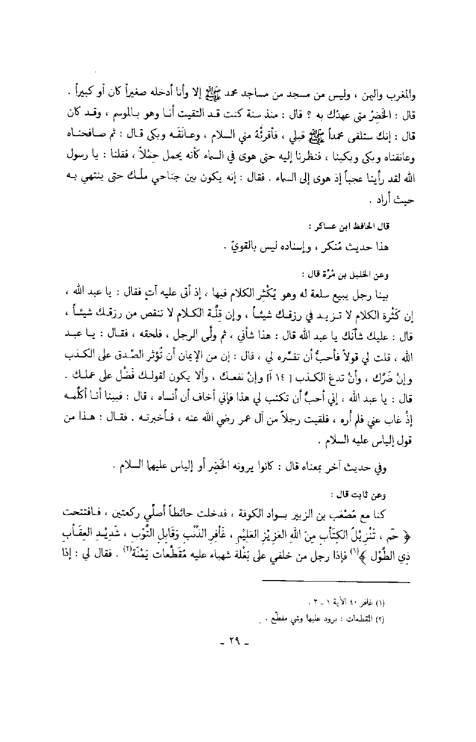 قال: الخضر متى عهدك به؟ قال: منذ سنة كنت قد التقيت أنا وهو بالموسم، وقد كان قال: إنك ستلقى محمد صَلَّى اللهُ عَلَيْهِ وَسَلَّمَ قبلي، فأقرئه مني السلام، وعانقه وبكى قال: ثم صافحناه وعانقناه وبكى وبكينا، فنظرنا إليه حتى هوى في السماء كأنه يحمل حملاً، فقلنا: يا رسول الله لقد رأينا عجباُ إذ هوى إلى السماء.