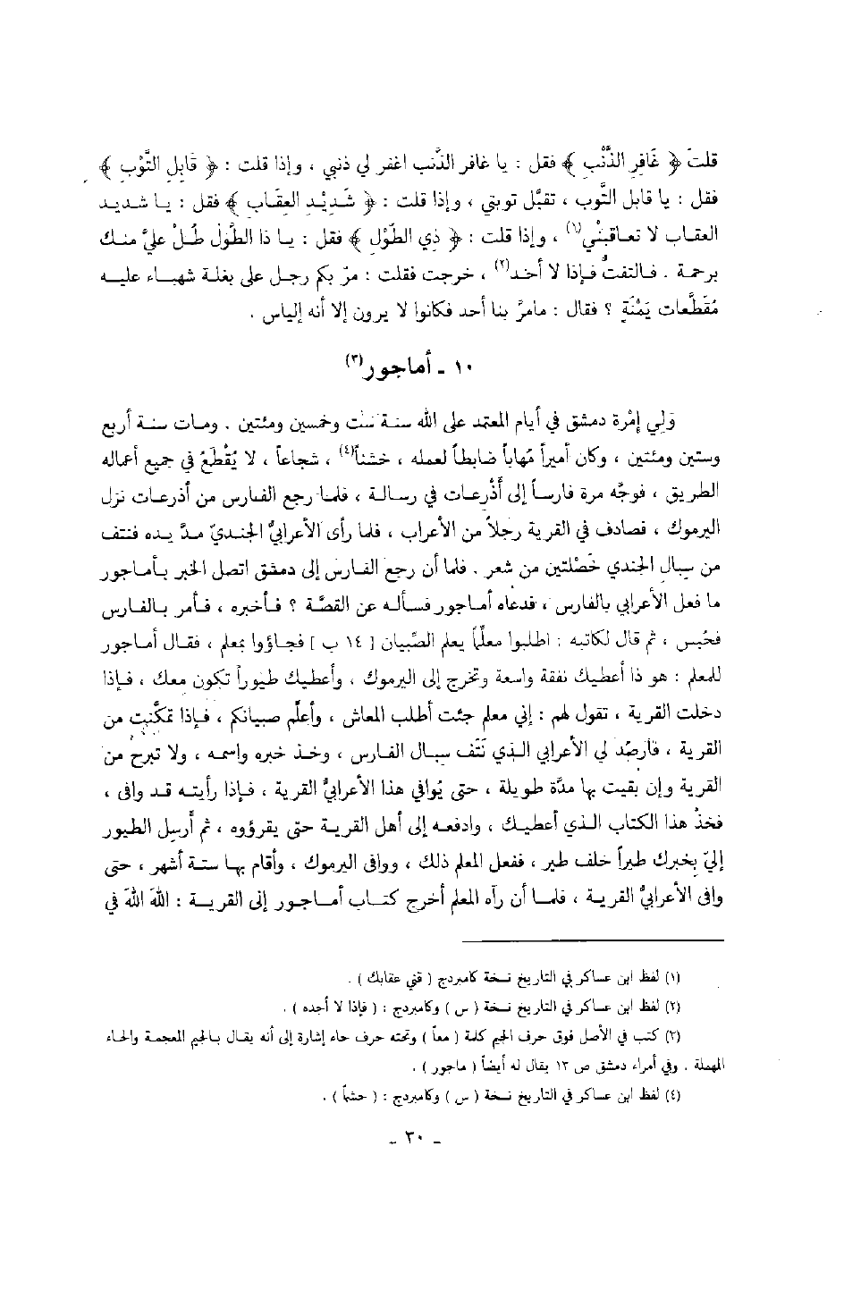 فلما أن رجع الفارس إلى دمشق اتصل الخبر بأماجور ما فعل الأعرابي بالفارس، فدعاه أماجور فسأله عن القصة؟ فأخبره، فأمر بالفارس فحبس، ثم قال لكاتبه: اطلبوا معلماً يعلم الصبيان فجاؤوا بمعلم، فقال أماجور للمعلم: هو ذا أعطيك نفقة واسعة وتخرج إلى اليرموك، وأعطيك طيوراً تكون معك، فإذا دخلت القرية، تقول لهم: إني معلم جئت أطلب المعاش، وأعلم صبيانكم، فإذا تمكنت من القرية، فارصد لي الأعرابي الذي نتف سبال الفارس، وخذ خبره واسمه، ولا تبرح من القرية وإن بقيت بها مدة طويلة، حتى يوافي هذا الأعرابي القرية، فإذا رأيته قد وافى، فخذ هذا الكتاب الذي أعطيك، وادفعه إلى أهل القرية حتى يقرؤوه، ثم أرسل الطيور إلي بخبرك طيراً خلف طير، ففعل المعلم ذلك، ووافى اليرموك، وأقام بها ستة أشهر، حتى وافى الأعرابي القرية، فلما أن رآه المعلم أخرج كتاب أماجور إلى القرية: الله الله في