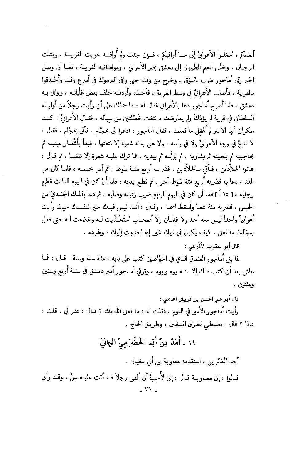 وخلى المعلم الطيور إلى دمشق بخبر الأعرابي، وموافاته القرية، فلما أن وصل الخبر إلى أماجور ضرب بالبوق، وخرج من وقته حتى وافى اليرموك في أسرع وقت وأحدقوا بالقرية، فأصاب الأعرابي في وسط القرية، فأخذه وأردفه خلف بعض غلمانه، ووافى به دمشق، فلما أصبح أماجور دعا بالأعرابي فقال له: ما حملك على أن رأيت رجلاً من أولياء السلطان في قرية لم يؤذك ولم يعارضك، نتفت خصلتين من سباله، فقال الأعرابي: كنت سكران أيها الأمير لم أعقل ما فعلت، فقال أماجور: ادعوا لي بحجام، فأتي بحجام، فقال: لا تدع في وجه الأعرابي ولا في رأسه، ولا على بدنه شعرة إلا نتفتها، فبدأ بأشفار عينيه ثم بحاجبيه ثم بلحيته ثم بشاربه، ثم برأسه، ثم بيديه، فما ترك عليه شعرة إلا نتفها، ثم قال: هاتوا الجلادين، فأتي بالجلادين، فضربه أربع مئة سوط، ثم أمر بحبسه، فلما كان من الغد، دعا به فضربه أربع مئة سوط آخر، ثم قطع يديه، فلما أن كان اليوم الثالث قطع رجليه فلما أن كان في اليوم الرابع ضرب رقبته وصلبه، ثم دعا بذلك الجندي من الحبس، فضربه مائة عصا وأسقط اسمه، وقال: أنت ليس فيك خير لنفسك حيث رأيت أعرابياً واحداً ليس معه أحد ولا غلمان ولا أصحاب استخذيت له وخضعت له حتى فعل بسبالك ما فعل.