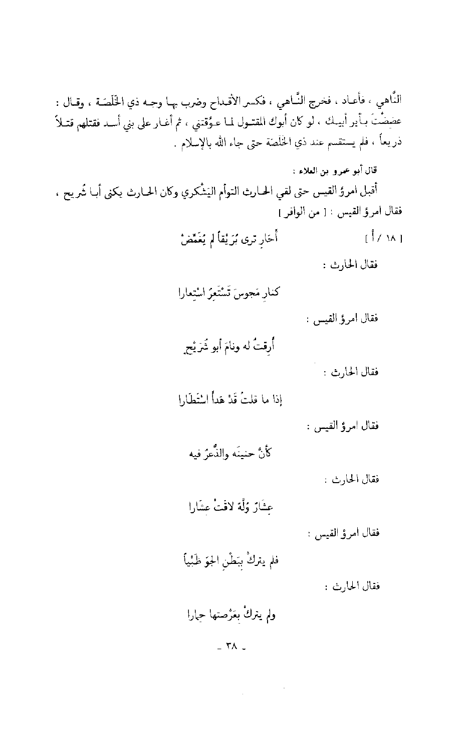 قال أبو عمرو بن العلاء: أقبل امرؤ القيس حتى لقي الحارث التوأم اليشكري وكان الحارث يكنى أبا شريح، فقال امرؤ القيس: " من الوافر "
