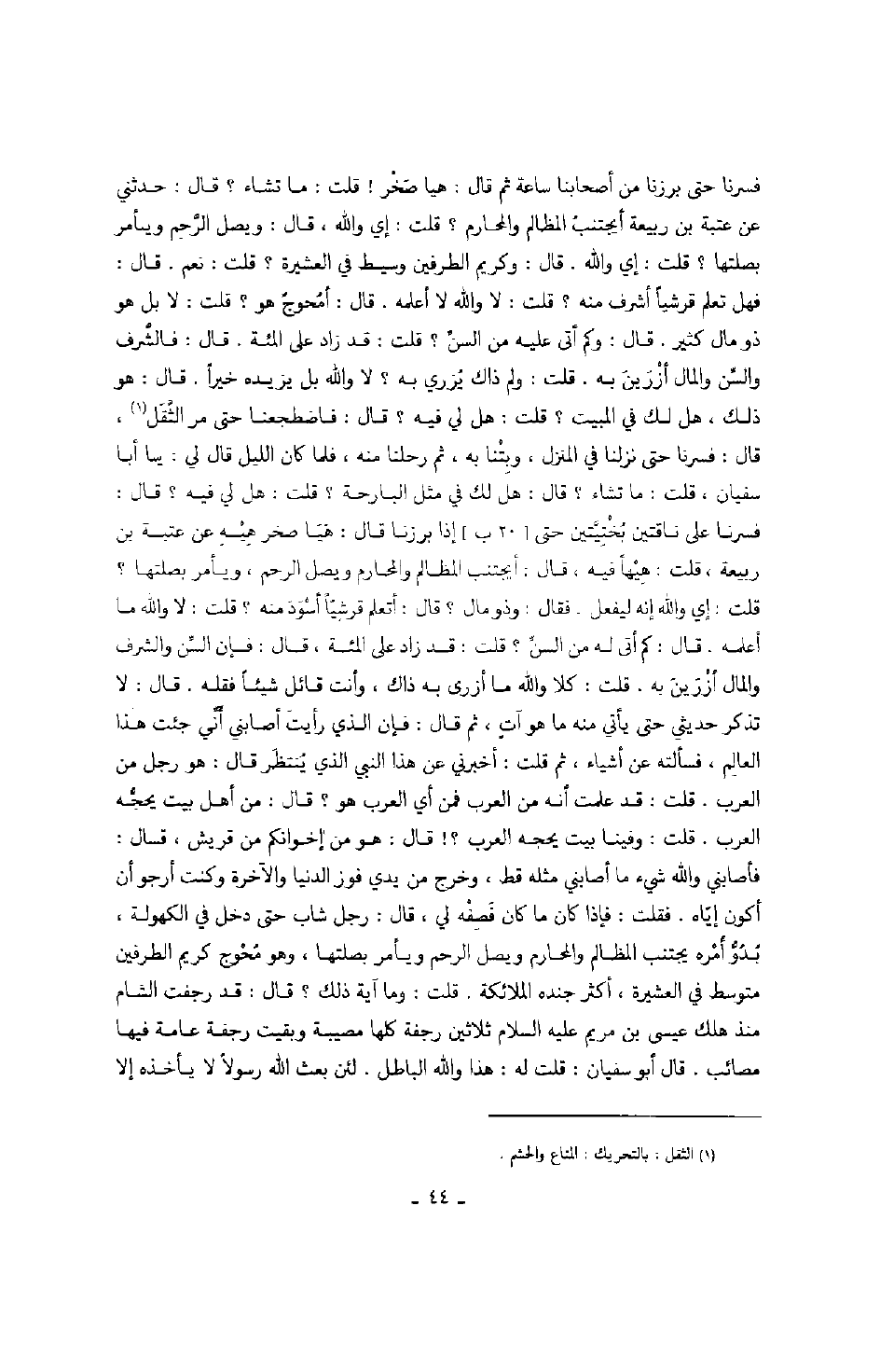 قال: هو ذلك، هل لك في المبيت؟ قلت: هل لي فيه؟ قال: فاضطجعنا حتى مر الثقل، قال: فسرنا حتى نزلنا في المنزل، وبتنا به، ثم رحلنا منه، فلما كان الليل قال لي: يا أبا سفيان، قلت: ما تشاء؟ قال: هل لك في مثل البارحة؟ قلت: هل لي فيه؟ قال: فسرنا على ناقتين بختيتين حتى إذا برزنا قال: هيا صخر هيه عن عتبة بن ربيعة، قلت: هيهاً فيه، قال: أيجتنب المظالم والمحارم ويصل الرحم، ويأمر بصلتها؟ قلت: إي والله إنه ليفعل.