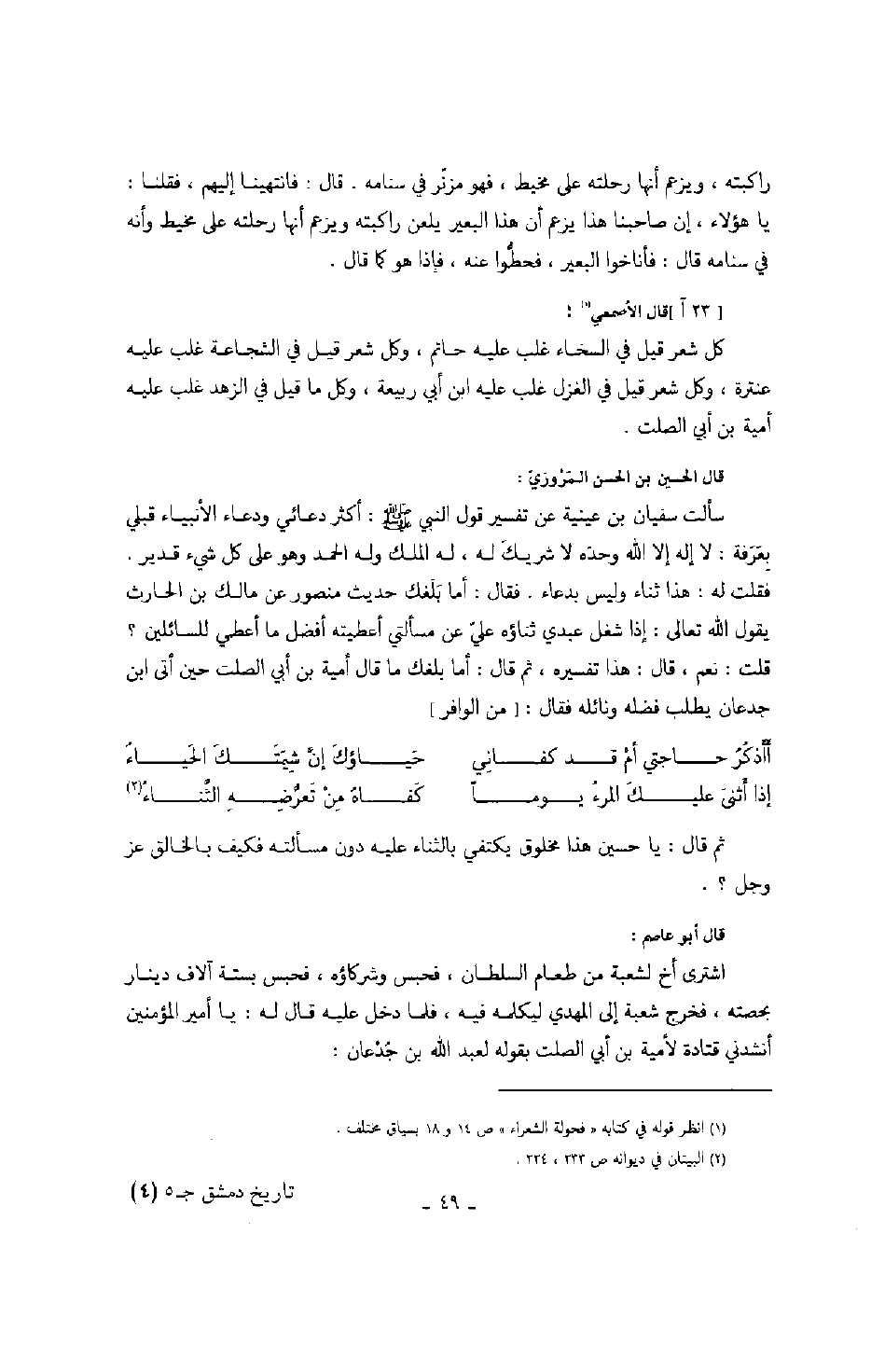 فقال: أما بلغك حديث منصور عن مالك بن الحارث يقول الله تعالى: " إذا شغل عبدي ثناؤه علي عن مسألتي أعطيته أفضل ما أعطي للسائلين؟ " قلت: نعم، قال: هذا تفسيره، ثم قال: أما بلغك ما قال أمية بن أبي الصلت حين أتى ابن جدعان يطلب فضله ونائله فقال: " من الوافر "