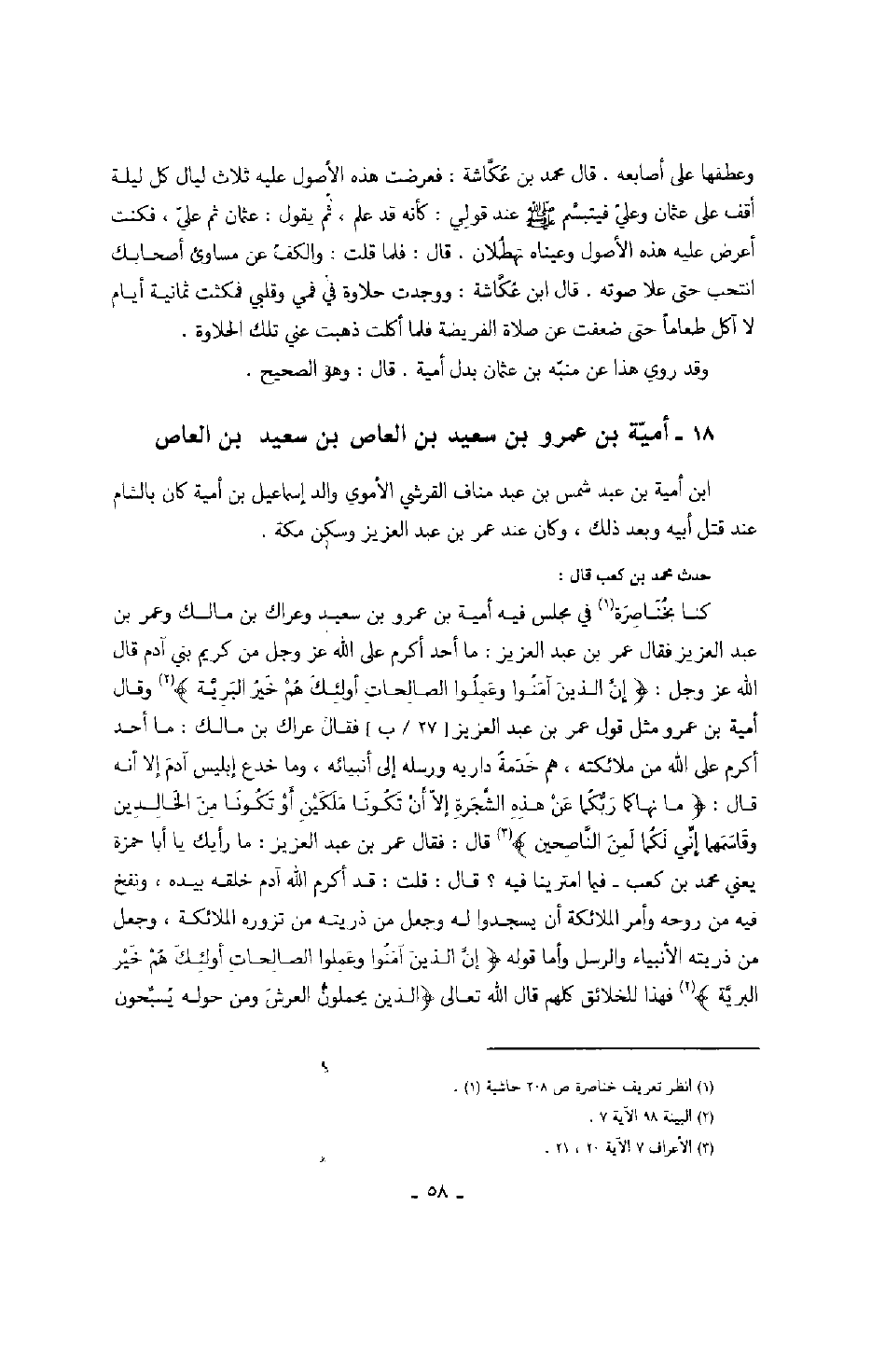 حدث محمد بن كعب قال: كنا بخناصرة في مجلس فيه أمية بن عمرو بن سعيد وعراك بن مالك وعمر بن عبد العزيز فقال عمر بن عبد العزيز: ما أحد أكرم على الله عز وجل من كريم بني آدم قال الله عز وجل: " إن الذين آمنوا وعملوا الصالحات أولئك هم خير البرية " وقال أمية بن عمرو مثل قول عمر بن عبد العزيز فقال عراك بن مالك: ما أحد أكرم على الله من ملائكته، هم خدمة داريه ورسله إلى أنبيائه، وما خدع إبليس آدم إلا أنه قال: " ما نهاكما ربكما عن هذه الشجرة إلا أن تكونا ملكين أو تكونا من الخالدين وقاسمهما إني لكما من الناصحين " قال: فقال عمر بن عبد العزيز: ما رأيك يا أبا حمزة - يعني محمد بن كعب - فيما امترينا فيه؟ قال: قلت: قد أكرم الله آدم خلقه بيده، ونفخ فيه من روحه وأمر الملائكة أن يسجدوا له وجعل من ذريته من تزوره الملائكة، وجعل من ذريته الأنبياء والرسل وأما قوله " إن الذين آمنوا وعملوا الصالحات أولئك هم خير البرية " فهذا للخلائق كلهم قال الله تعالى: " والذين يحملون العرش ومن حوله يسبحون
