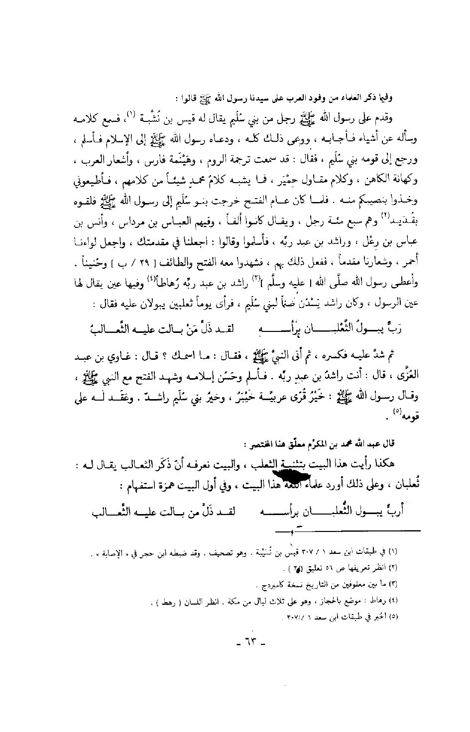 وفيما ذكر العلماء من وفود العرب على سيدنا رسول الله صَلَّى اللهُ عَلَيْهِ وَسَلَّمَ قالوا: وقدم على رسول الله صَلَّى اللهُ عَلَيْهِ وَسَلَّمَ رجل من بني سليم يقال له قيس بن نشبة، فسمع كلامه وسأله عن أشياء فأجابه، ووعى ذلك كله، ودعاه رسول الله صَلَّى اللهُ عَلَيْهِ وَسَلَّمَ إلى الإسلام فأسلم، ورجع إلى قومه بني سليم، فقال: قد سمعت ترجمة الروم، وهيمنة فارس، وأشعار العرب، وكهانة الكاهن، وكلام مقاول حمير، فما يشبه كلام محمدٍ شيئاً من كلامهم، فأطيعوني وخذوا بنصيبكم منه.