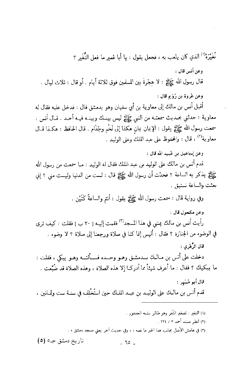وعن عروة بن رويم قال: أقبل أنس بن مالك إلى معاوية بن أبي سفيان وهو بدمشق قال: فدخل عليه فقال له معاوية: حدثني بحديث سمعته من النبي صَلَّى اللهُ عَلَيْهِ وَسَلَّمَ ليس بينك وبينه فيه أحد.