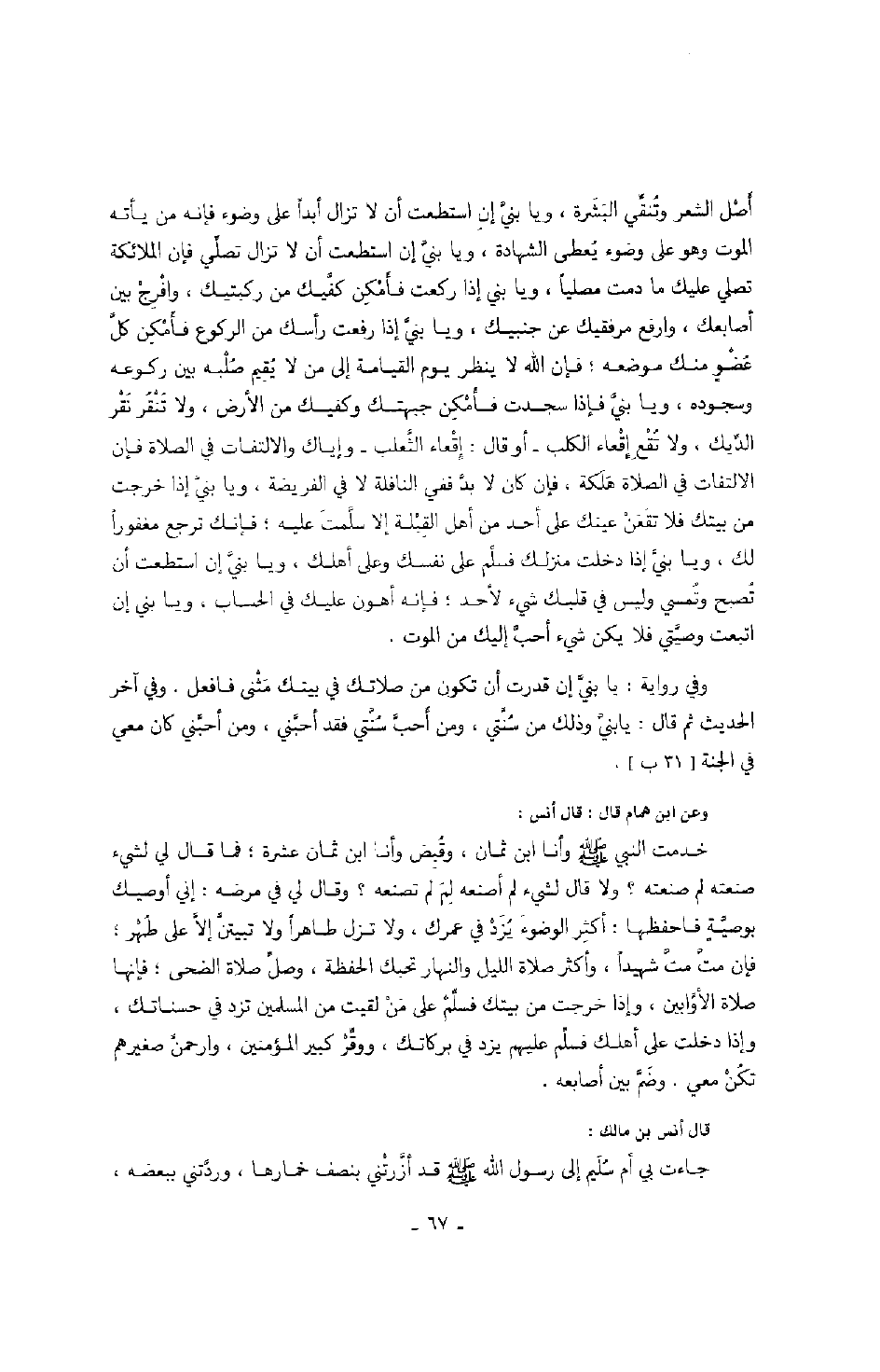 وعن ابن همام قال: قال أنس: خدمت النبي صَلَّى اللهُ عَلَيْهِ وَسَلَّمَ وأنا ابن ثمان، وقبض وأنا ابن ثمان عشرة؛ فما قال لي لشيء صنعته لما صنعته؟ ولا قال لشيء لم أصنعه لمَ لم تصنعه؟ وقال لي في مرضه: إني أوصيك بوصية فاحفظها: " أكثر الوضوء يزد في عمرك، ولا تزل طاهراً ولا تبيتن إلا على طهر؛ فإن مت متَ شهيداً، وأكثر صلاة الليل والنهار تحبك الحفظة، وصل صلاة الضحى؛ فإنها صلاة الأوابين، وإذا خرجت من بيتك فسلم على من لقيت من المسلمين تزد في حسناتك، وإذا دخلت على أهلك فسلم عليهم يزد في بركاتك، ووقر كبير المؤمنين، وارحمنّ صغيرهم تكن معي ".