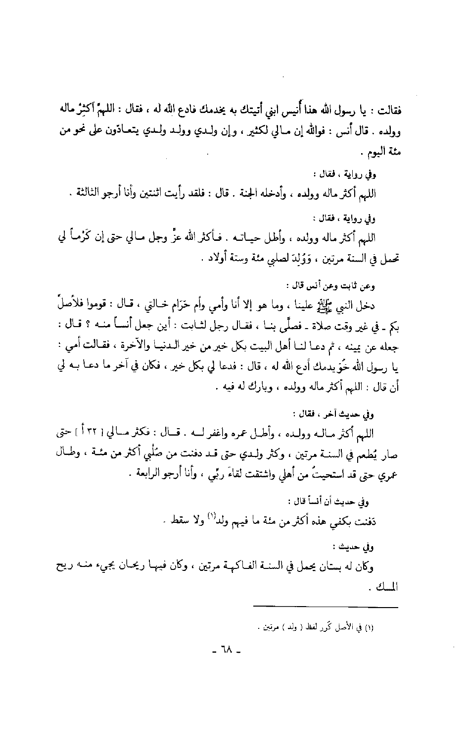 فقالت: يا رسول الله هذا أنيس ابني أتيتك به يخدمك فادع الله له، فقال: " اللهم أكثر ماله وولده ".