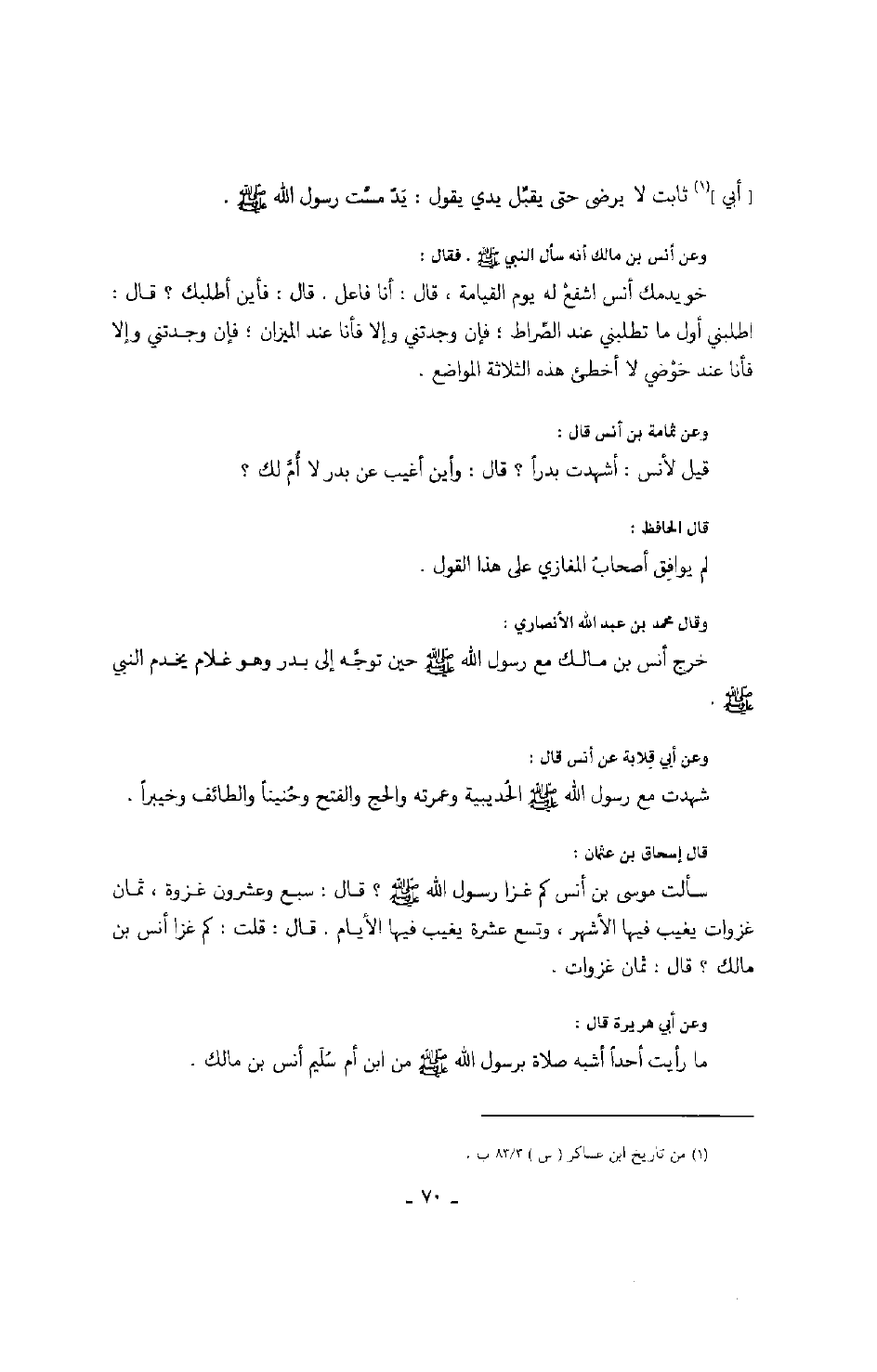 وعن ثمامة بن أنس قال: قيل لأنس: أشهدت بدراً؟ قال: وأين أغيب عن بدر لا أم لك؟ قال الحافظ: لم يوافق أصحاب المغازي على هذا القول.