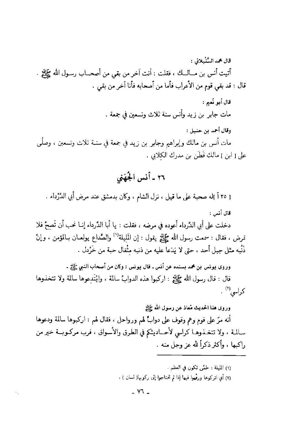 وروى يونس بن محمد بسنده عن أنس، قال يونس: وكان من أصحاب النبي صَلَّى اللهُ عَلَيْهِ وَسَلَّمَ قال: قال رسول الله صَلَّى اللهُ عَلَيْهِ وَسَلَّمَ: " اركبوا هذه الدواب سالمة، وايتدعوها سالمة ولا تتخذوها كراسي ".