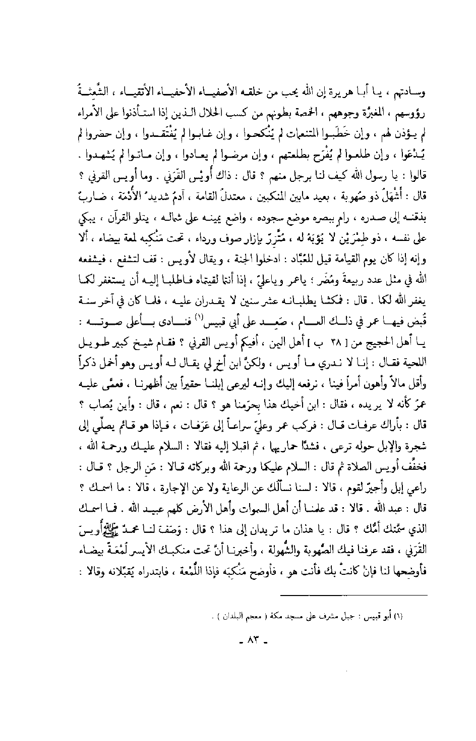 قال: فمكثا يطلبانه عشر سنين لا يقدران عليه، فلما كان في آخر سنة قبض فيها عمر في ذلك العام، صعد على أبي قبيس فنادى بأعلى صوته: يا أهل الحجيج أهل اليمن، أفيكم أويس القرني؟ فقام شيخ كبير طويل اللحية فقال: إنا لا ندري ما أويس، ولكن ابن أخ لي يقال له أويس وهو أخمل ذكراً وأقل مالاً وأهون أمراً فينا، نرفعه إليك وإنه ليرعى إبلنا حقيراً بين أظهرنا، فعمى عليه عمر كأنه لا يريده، فقال: ابن أخيك هذا بحرمنا هو؟ قال: نعم، قال: وأين يصاب؟ قال: بأراك عرفات قال: فركب عمر وعلي سراعاً إلى عرفات، فإذا هو قائم يصلي إلى شجرة والإبل حوله ترعى، فشدا حماريهما، ثم أقبلا إليه فقالا: السلام عليك ورحمة الله، فخفف أويس الصلاة ثم قال: السلام عليكما ورحمة الله وبركاته قالا: من الرجل؟ قال: راعي أبل وأجيرٌ لقوم، قالا: لسنا نسألك عن الرعاية ولا عن الإجارة، قالا: ما اسمك؟ قال: عبد الله.