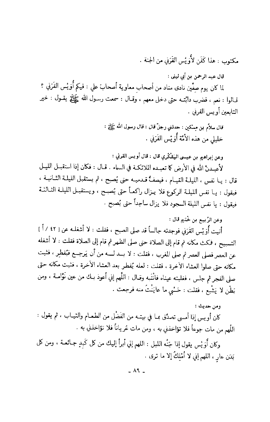 وعن الربيع بن خثيم قال: أتيت أويس القرني فوجدته جالساً قد صلى الصبح، فقلت: لا أشغله عن، فمكث مكانه ثم قام إلى الصلاة حتى صلى الظهر ثم قام إلى الصلاة فقلت: لا أشغله عن العصر فصلى العصر ثم صلى المغرب، فقلت: لابد له من أن يرجع فيفطر، فثبت مكانه حتى صلوا العشاء الآخرة، فقلت: لعله يفطر بعد العشاء الآخرة، فثبت مكانه حتى صلى الفجر ثم جلس، فغلبته عيناه فانتبه وقال: اللهم إني أعوذ بك من عين نوامة، ومن بطن لا يشبع، فقلت: بي ما عاينت منه فرجعت.