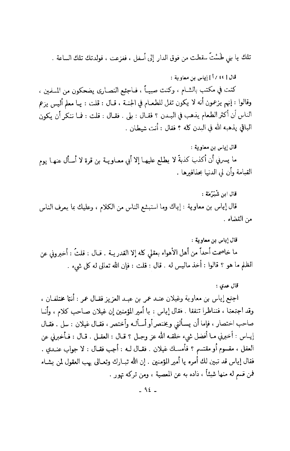 إياس بن معاوية: كنت في مكتب بالشام، وكنت صبياً، فاجتمع النصارى يضحكون من المسلمين، وقالوا: إنهم يزعمون أنه لا يكون تفل للطعام في الجنة، قال: قلت: يا معلم أليس يزعم الناس أن أكثر الطعام يذهب في البدن؟ فقال: بلى.