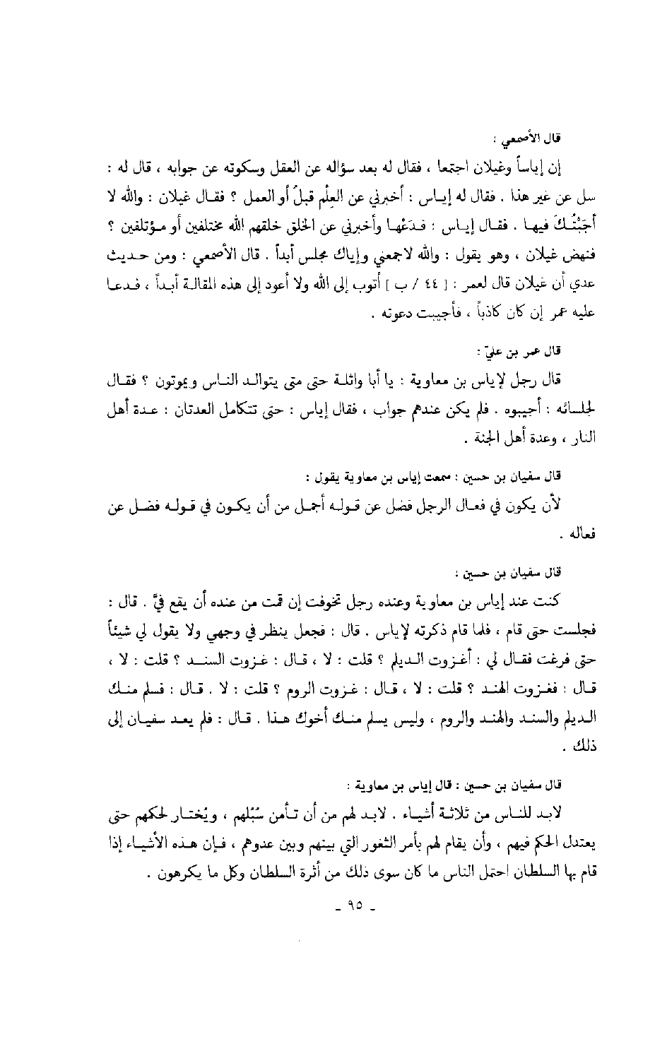 قال الأصمعي: إن إياساً وغيلان اجتمعا، فقال له بعد سؤاله عن العقل وسكوته عن جوابه، قال له: سل عن غير هذا.