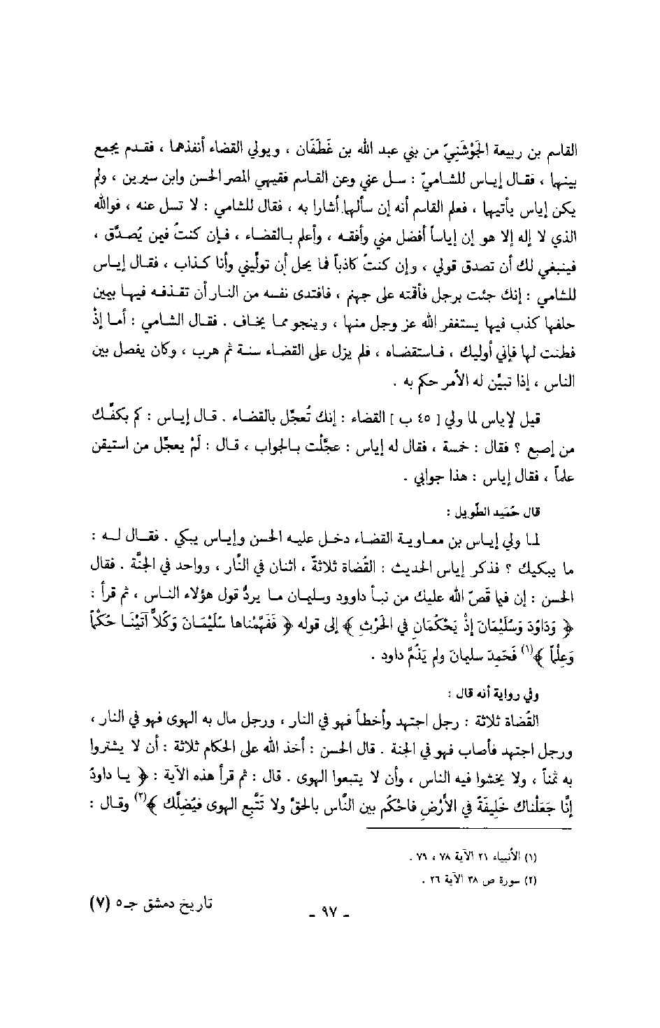 القاسم بن ربيعة الجوشني من بني عبد الله بن غطفان، ويولي القضاء أنفذهما، فقدم يجمع بينهما، فقال إياس للشامي: سل عني وعن القاسم فقيهي المصر الحسن وابن سيرين، ولم يكن إياس يأتيهما، فعلم القاسم أنه إن سألهما أشارا به، فقال للشامي: لا تسل عنه، فوالله الذي لا إله إلا هو إن إياساً أفضل مني وأفقه، وأعلم بالقضاء، فإن كنت فيمن يصدق، فينبغي لك أن تصدق قولي، وإن كنت كاذباً فما يحل أن توليني وأنا كذاب، فقال إياس للشامي: إنك جئت برجل فأقمته على جهنم، فافتدى نفسه من النار أن تقذفه فيها بيمين حلفها كذب فيها يستغفر الله عز وجل منها، وينجو مما يخاف.