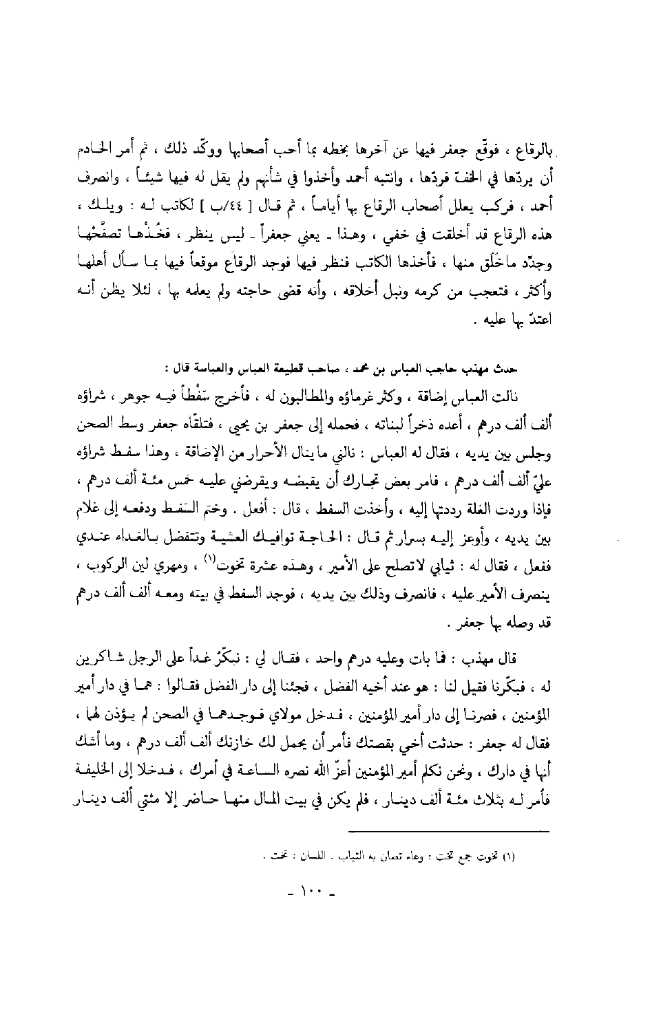 حدث مهذب حاجب العباس بن محمد، صاحب قطيعة العباس والعباسة قال: نالت العباس إضافة، وكثر غرماؤها والمطالبون له، فأخرج سفطا فيه جوهر، شراؤه ألف ألف درهم، أعده ذخراً لبناته، فحمله إلى جعفر بن يحيى، فتلقاه جعفر وسط الصحن وجلس بين يديه، فقال له العباس: نالني ما ينال الأحرار من الإضافة، وهذا سفط شراؤه علي ألف درهم، فامر بعض تجارك أن يقبضه ويقرضني عليه خمس مائة ألف درهم فإذا وردت الغلة رددتها إليه، وأخذت السفط، قال: أفعل. وختم السفط ودفعه إلى غلام بين يديه، وأوعز إليه بسرار ثم قال: الحاجة توافيك العشية وتتفضل بالغداء عندي ففعل، فقال له: ثيابي لا تصلح على الأمير، وهذه عشرة تخوت، ومهري لين الركوب، ينصرف الأمير عليه، فانصرف وذلك بين يديه، فوجد السفط في بيته ومعه ألف ألف درهم قد وصله بها جعفر.