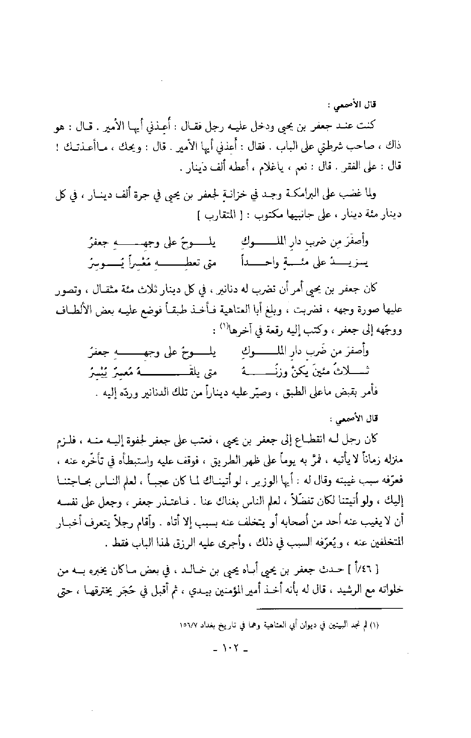 كان جعفر بن يحيى أمر أن تضرب له دنانير، في كل دينار ثلاث مائة مثقال، وتصور عليها صورة وجهه، فضربت، وبلغ أبا العتاهية فأخذ طبقا فوضع عليه بعض الألطاف ووجهه إلى جعفر، وكتب إليه رقعة في آخرها: