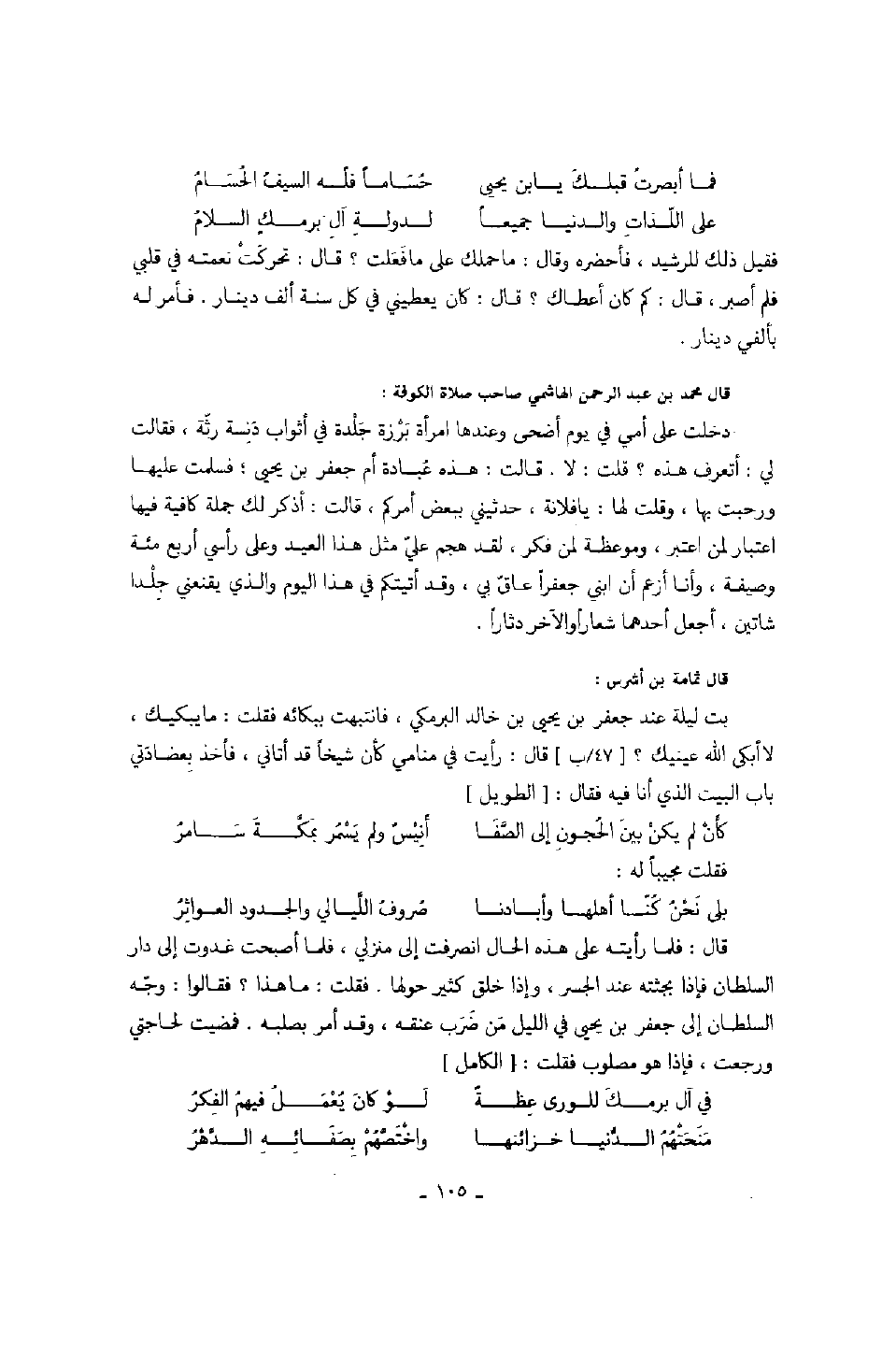 قال: فلما رأيته على هذه الحال انصرفت إلى منزلي، فلما أصبحت غدوت إلى دار السلطان فإذا بجثته عند الجسر، وإذا خلق كثير حولها. فقلت: ما هذا؟ فقالوا: وجه السلطان إلى جعفر بن يحيى في الليل من ضرب عنفه، وقد أمر بصلبه. فمضيت لحاجتي ورجعت، فإذا هو مصلوب فقلت: