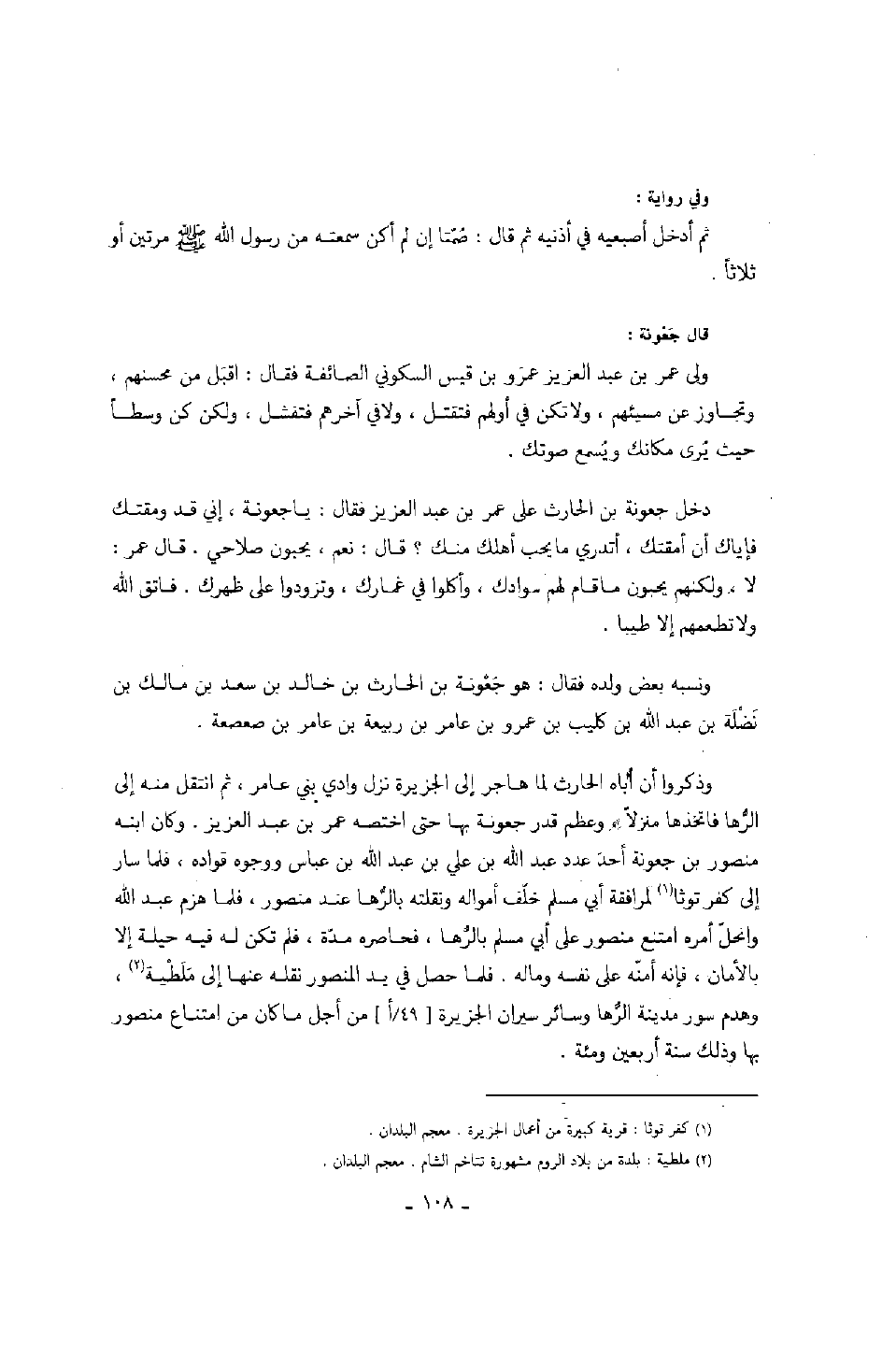 وذكروا أن أباه الحارث لما هاجر إلى الجزيرة نزل وادي بني عامر، ثم انتقل منه إلى الرها فاتخذها منزلا، وعظم قدر جعونة بها حتى اختصه عمر بن عبد العزيز. وكان ابنه منصور بن جعونة أحد عدد عبد الله بن علي بن عبد الله بن عباس ووجوه قواده، فلما سار إلى كفر توثا لمرافقة أبي مسلم خلف أمواله ونقلته بالرها عند منصور، فلما هزم عبد الله وانحل أمره امتنع منصور على أبي مسلم بالرها بالرها، فحاصره مدة، فلم تكن له فيه حيلة إلا بالأمان، فإنه أمنه على نفسه وماله. فلما حصل في يد المنصور نقله عنها إلى ملطية، وهدم سور مدينة الرها وسائر سيران الجزيرة من أجل ما كان من امتناع منصور بها وذلك سنة أربعين ومائة.