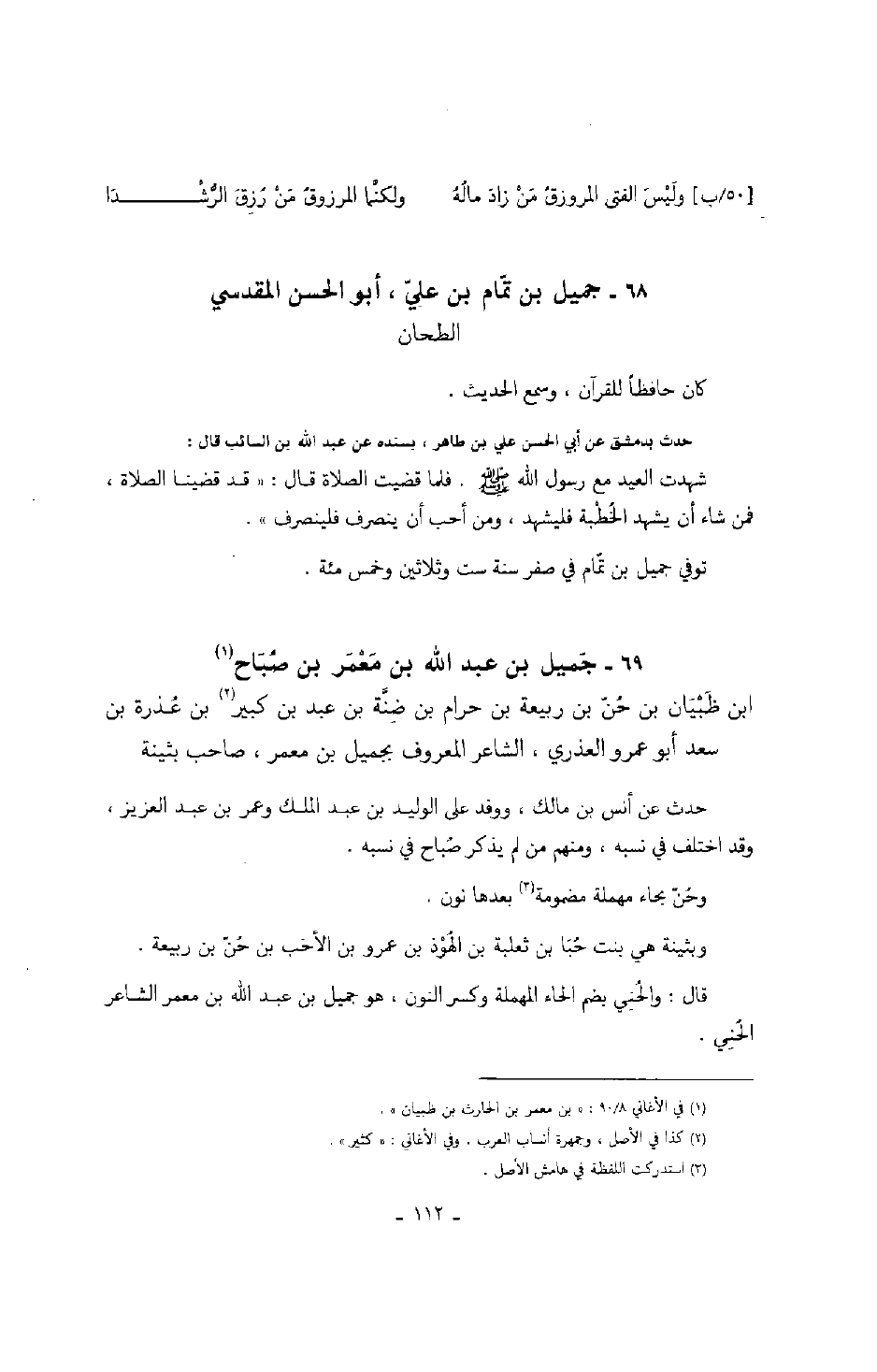 ابن صباح بن ظبيان بن حن بن ربيعة بن حرام بن ضنة بن عبد بن كبير بن عذرة بن سعد أبو عمرو العذري الشاعر المعروف بجميل بن معمر صاحب بثينة حدث عن أنس بن مالك، ووفد على الوليد بن عبد الملك وعمر بن عبد العزيز، وقد اختلف في نسبه، ومنهم من لم يذكر صباح في نسبه.