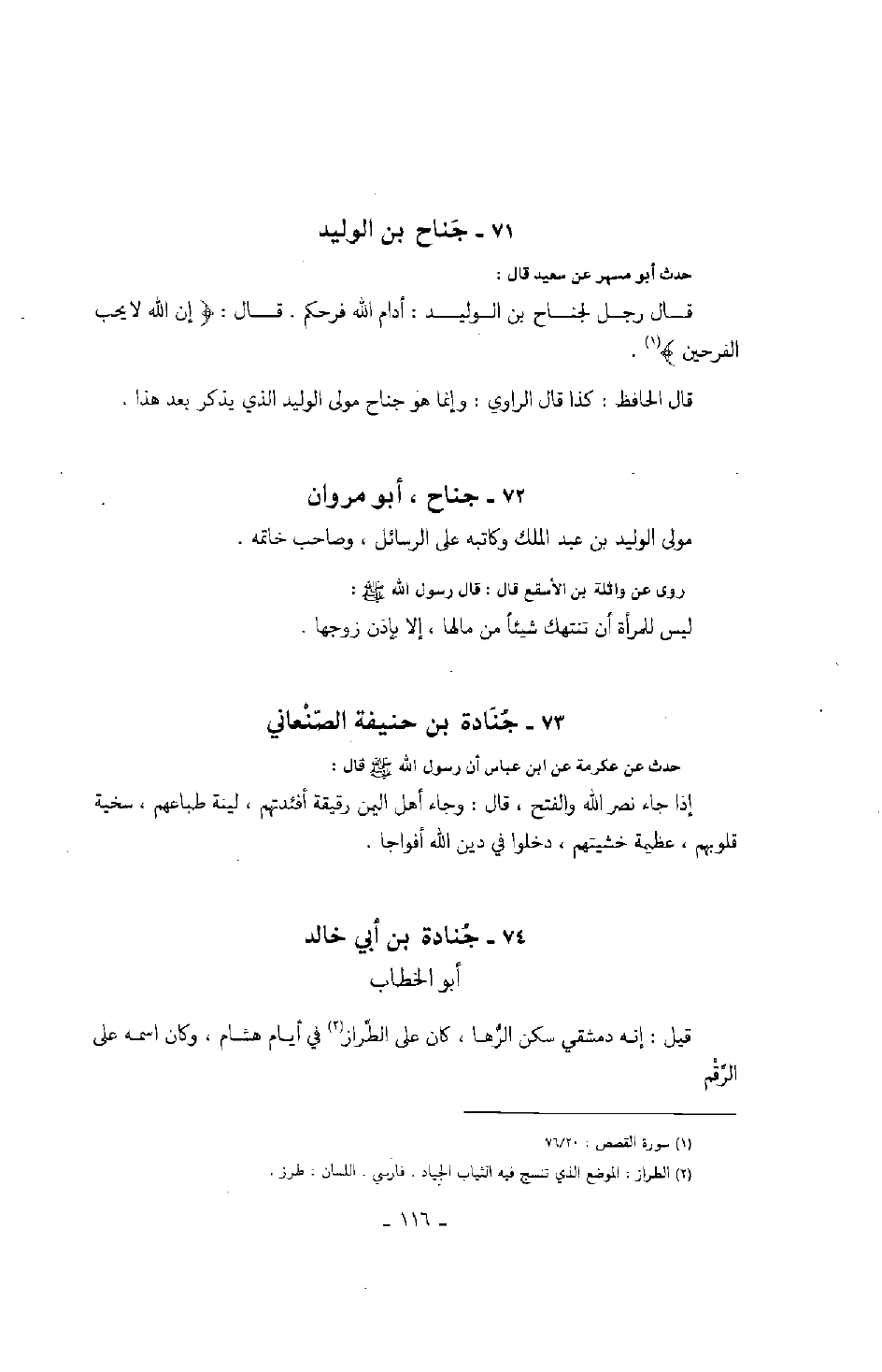 حدث أبو مسهر عن سعيد قال: قال رجل لجناح بت الوليد: أدام الله فرحكم. قال: " إن الله لا يحب الفرحين ".
