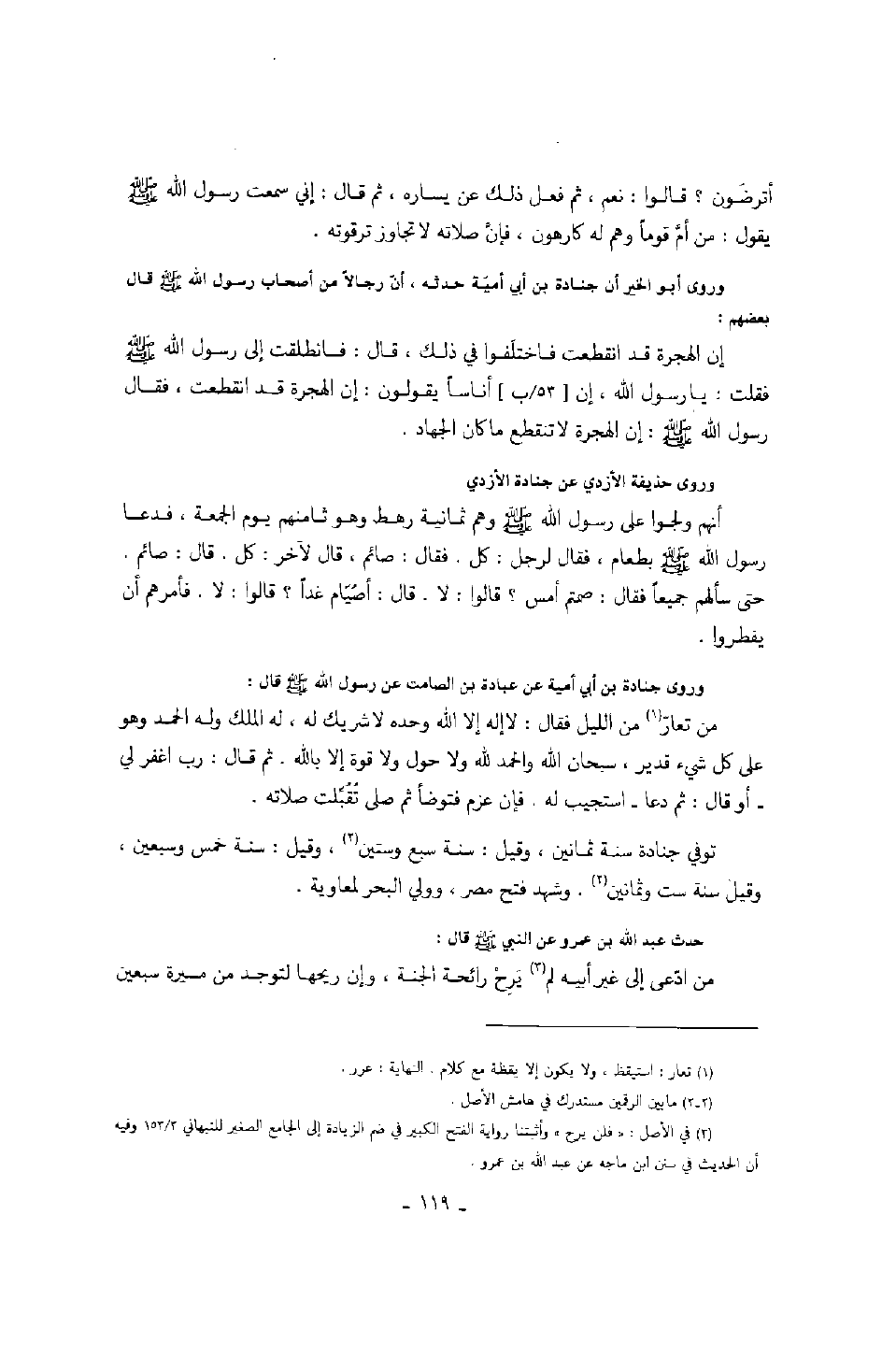 وروى أبو الخير أن جنادة بن أبي أمية حدثه، أنّ رجالاً من أصحاب رسول الله صَلَّى اللهُ عَلَيْهِ وَسَلَّمَ قال بعضهم: إن الهجرة قد انقطعت فاختلفوا في ذلك، قال: فانطلقت إلى رسول الله فقلت: يا رسول الله، إن أناساً يقولون: إن الهجرة قد انقطعت، فقال رسول الله صَلَّى اللهُ عَلَيْهِ وَسَلَّمَ: إن الهجرة لا تنقطع ما كان الجهاد.