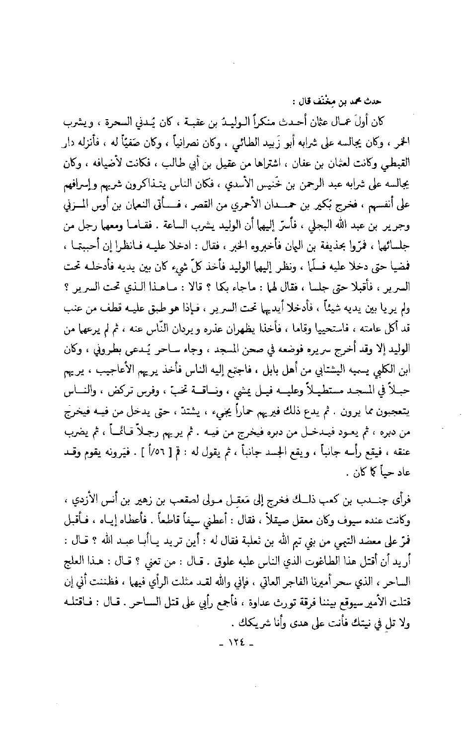 حدث محمد بن مخنف قال: كان أول عمال عثمان أحدث منكراً الوليد بن عقبة، كان يدني السحرة، ويشرب الخمر، وكان يجالسه على شرابه أبو زبيد الطائي، وكان نصرانياً، وكان صفياً له، فأنزله دار القبطي وكانت لعثمان بن عفان، اشتراها من عقيل بن أبي طالب، فكانت لأضيافه، وكان يجالسه على شرابه عبد الرحمن بن خنيس الأسدي، فكان الناس يتذاكرون شربهم وإسرافهم على أنفسهم، فخرج بكير بن حمدان الأحمري من القصر، فأتى النعمان بن أوس المزني وجرير بن عبد الله البجلي، فأسر إليهما أن الوليد يشرب الساعة. فقاما ومعهما رجل من جلسائهما، فمروا بحذيفة بن اليمان فأخبروه الخبر، فقال: ادخلا عليه فانظرا إن أحببتما، فمضيا حتى دخلا عليه فسلما، ونظر إليهما الوليد فأخذ كل شيء كان بين يديه فأدخله تحت السرير، فأقبلا حتى جلسا، فقال لهما: ما جاء بكما؟ قالا: ما هذا الذي تحت السرير؟ ولم يريا بين يديه شيئاً، فأدخلا أيديهما تحت السرير، فإذا هو طبق عليه قطف من عنب قد أكل عامته، فاستحييا وقاما، فأخذا يظهران عذره ويردان الناس عنه، ثم لم يرعهما من الوليد إلا وقد أخرج سريره فوضعه في صحن المسجد، وجاء ساحر يدعى بطروني، وكان ابن الكلبي يسميه اليشتابي من أهل بابل، فاجتمع إليه الناس فأخذ يريهم الأعاجيب، يريهم حبلاً في المسجد مستطيلاً وعليه فيل يمشي، وناقة تخب، وفرس تركض، والناس يتعجبون مما يرون. ثم يدع ذلك فيريهم حماراً يجيء، يشتد، حتى يدخل من فيه فيخرج من دبره، ثم يعود فيدخل من دبره فيخرج من فيه. ثم يريهم رجلاً قائماً، ثم يضرب عنقه، فيقع رأسه جانباً، ويقع الجسد جانباً، ثم يقول له: قم. فيرونه يقوم وقد عاد حياً كما كان.