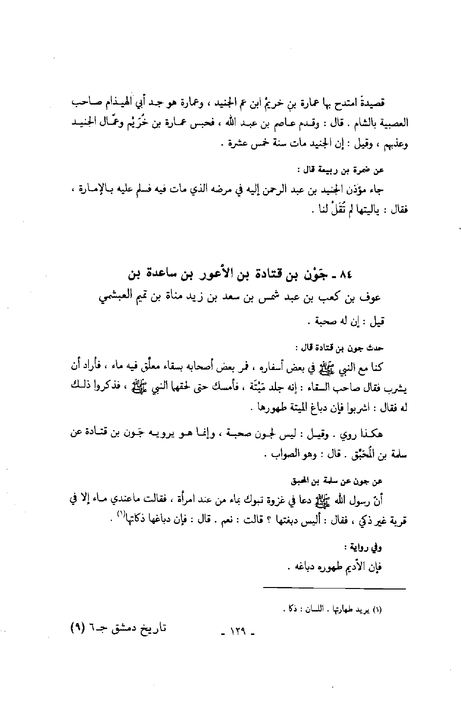 حدث جون بن قتادة قال: كنا مع النبي صَلَّى اللهُ عَلَيْهِ وَسَلَّمَ في بعض أسفاره، فمر بعض أصحابه بسقاء معلق فيه ماء، فأراد أن يشرب فقال صاحب السقاء: إنه جلد ميتة، فأمسك حتى لحقهما النبي صَلَّى اللهُ عَلَيْهِ وَسَلَّمَ، فذكروا ذلك له فقال: اشربوا فإن دباغ الميتة طهورها.