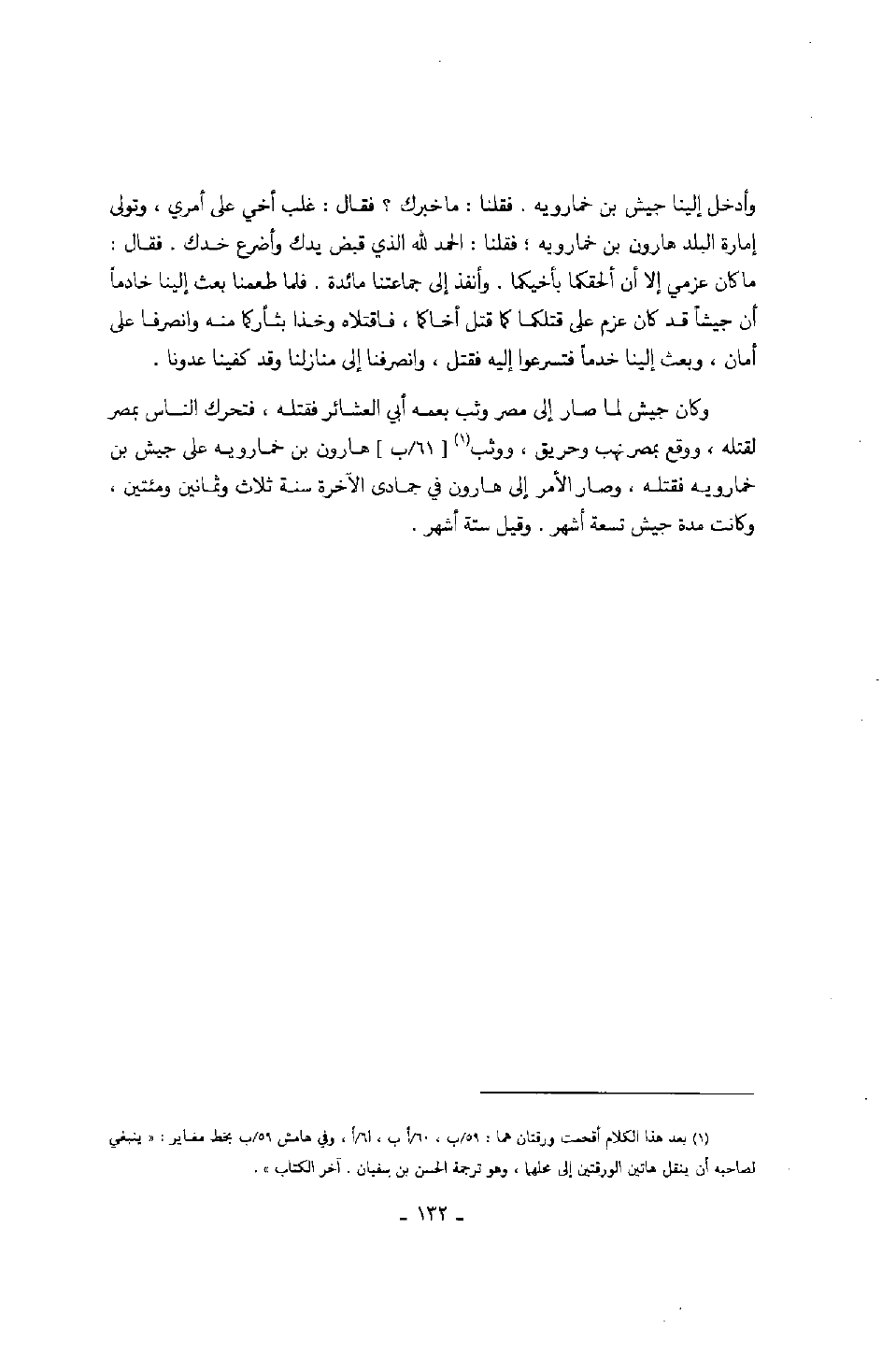 وأدخل إلينا جيش بن خمارويه. فقلنا: ما خبرك؟ فقال: غلب أخي على أمري، وتولى إمارة البلد هارون بن خمارويه؛ فقلنا: الحمد لله الذي قبض يدك وأضرع خدك. فقال: ما كان عزمي إلا أن أحقكما بأخيكما. وأنفذ إلى جماعتنا مائدة. فلما طعمنا بعث إلينا خادماً أن جيشاً قد كان عزم على قتلكما كما قتلأخاكما، فاقتلاه وخذا بثأركما منه وانصرفا على أمان، وبعث إلينا خدماً فتسرعوا إليه فقتل، وانصرفنا إلى منازلنا وقد كفينا عدونا.