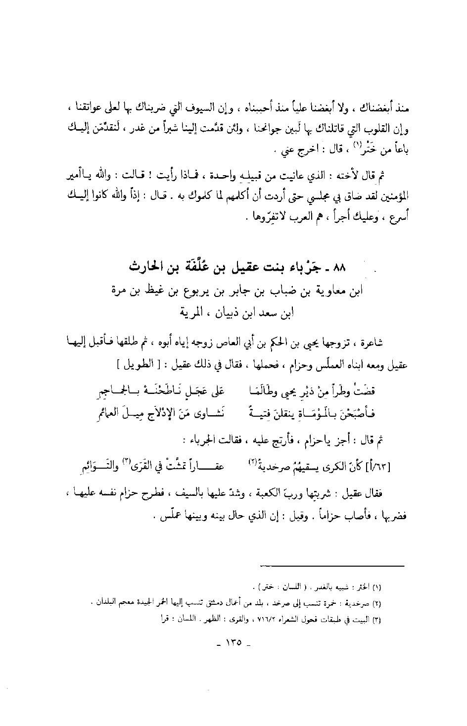 ثم قال: أجز يا حزام، فأرتج عليه، فقالت الجرباء: