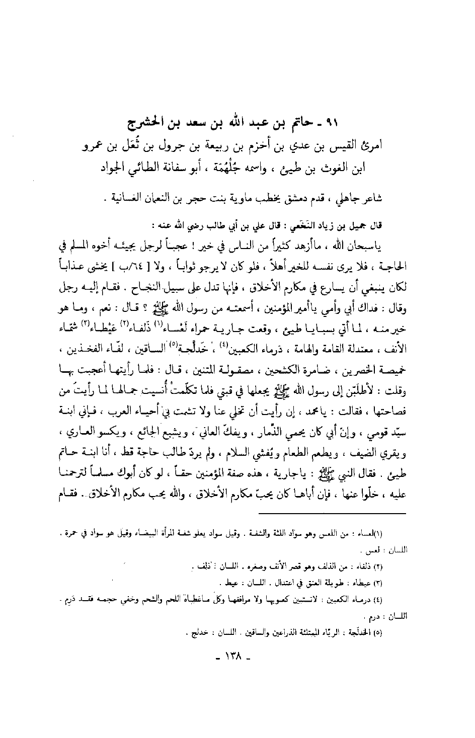 قال جميل بن زياد النخعي: قال علي بن أبي طالب رضي الله عنه: يا سبحان الله، ما أزهد كثيراً من الناس في خير! عجباً لرجل يجيئه أخوه المسلم في الحاجة، فلا يرى نفسه للخير أهلاً، فلو كان لا يرجو ثواباً، ولا يخشى عذاباً لكان ينبغي أن يسارع في مكارم الأخلاق، فإنها تدل على سبيل النجاح. فقام إليه رجل وقال: فداك أبي وأمي يا أمير المؤمنين، أسمعته من رسول الله صَلَّى اللهُ عَلَيْهِ وَسَلَّمَ؟ قال: نعم، وما هو خير منه، لما أتي بسبايا طيىء، وقعت جارية حمراء لعساء ذلفاء عيطاء شمّاء الأنف، معتدلة القامة والهامة، درماء الكعبين، خدلّجة الساقين، لفّاء الفخذين، خميصة الخصرين، ضامرة الكشحين، مصقولة المتنين، قال: فلما رأيتها أعجبت بها وقلت: لأطلبن إلى رسول الله صَلَّى اللهُ عَلَيْهِ وَسَلَّمَ يجعلها في قبتي فلما تكلمت أنسيت جمالها لما رأيت من فصاحتها، فقالت: يا محمد، إن رأيت أن تخلي عنا ولا تشمت بي أحياء العرب، فإني ابنة سيّد قومي، وإن أبي كان يحمي الذّمار، ويفك العاني، ويشبع الجائع، ويكسو العاري، ويقري الضيف، ويطعم الطعام ويفشي السلام، ولم يردّ طالب حاجة قط، أنا ابنة حاتم طيىء. فقال النبي صَلَّى اللهُ عَلَيْهِ وَسَلَّمَ: يا جارية، هذه صفة المؤمنين حقاً، لو كان أبوك مسلماً لترحمنا عليه، خلّوا عنها، فإن أباها كان يحبّ مكارم الأخلاق، والله يحب مكارم الأخلاق. فقام