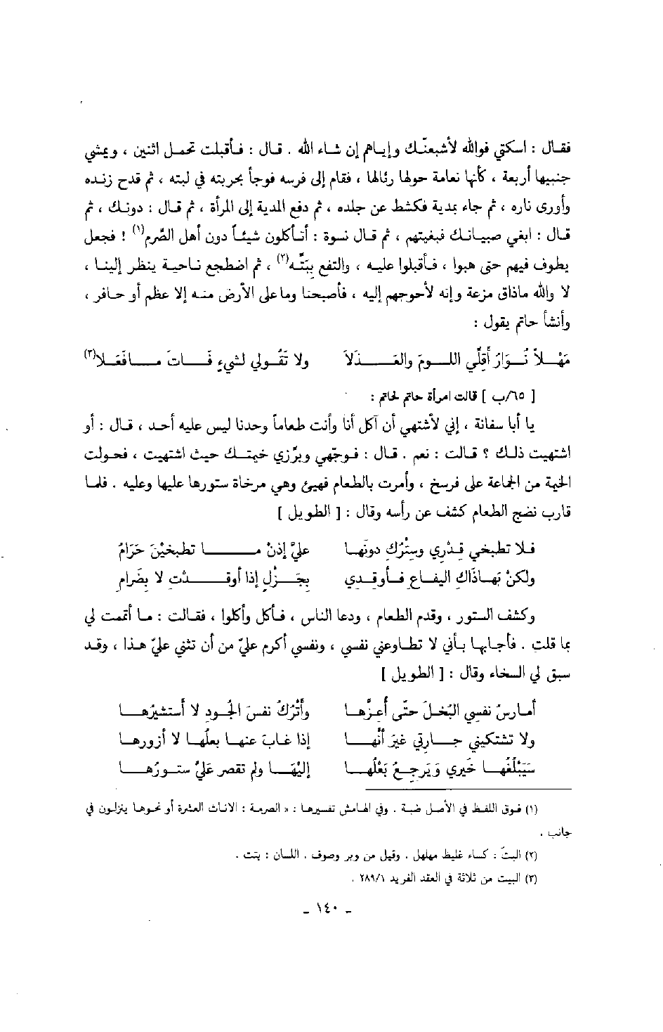 فقال: اسكتي فوالله لأشبعنك وإياهم إن شاء الله. قال: فأقبلت تحمل اثنين، ويمشي جنبيها أربعة، كأنها نعامة حولها رئالها، فقام إلى فرسه فوجاً بحربته في لبته، ثم قدح زنده وأورى ناره، ثم جاء بمدية فكشط عن جلده، ثم دفع المدية إلى المرأة، ثم قال: دونك، ثم قال: ابغي صبيانك فبغيتهم، ثم قال نسوة: أتأكلون شيئاً دون أهل الصّرم! فجعل يطوف فيهم حتى هبوا، فأقبلوا عليه، والتفع ببتّه، ثم اضطجع ناحية ينظر إليها، لا والله ما ذاق مزعة وإنه لأحوجهم إليه، فأصبحنا وما على الأرض منه إلا عظم أو حافر، وأنشأ حاتم يقول:
