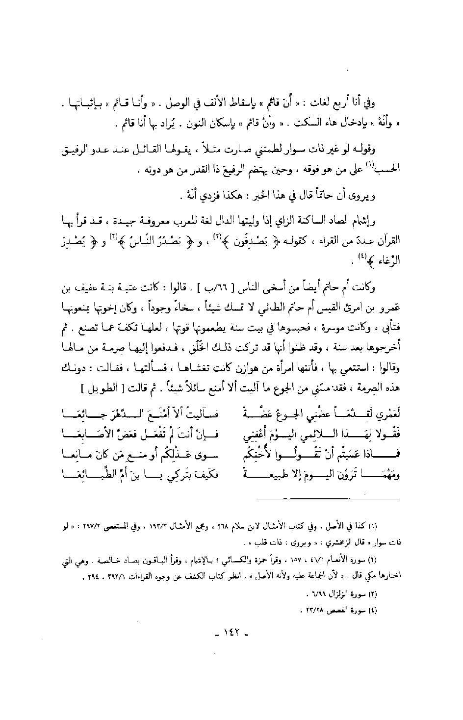 وفي أنا أربع لغات: " أن قائم " بإسقاط الألف في الوصل. " وأنا قائم " بإثباتها. " وأنه " بإدخال هاء السكت. " وأن قائم " بإسكان النون. يراد بها أنا قائم.