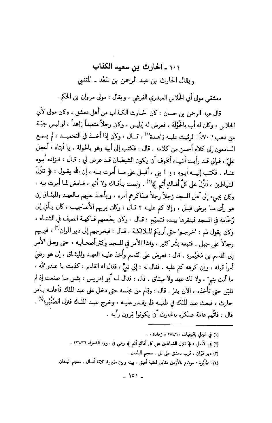 قال عبد الرحمن بن حسان: كان الحارث الكذاب من أهل دمشق، وكان مولى لأبي الجلاس، وكان له أب بالحولة، فعرض له إبليس، وكان رجلا متعبداً زاهداً، لو لبس جبة من ذهب لرئيت عليه زاهدة، قال: وكان إذا أخذ في التحميد، لم يسمع السامعون إلى كلام أحسن من كلامه. قال: فكتب إلى أبيه وهو بالحولة، يا أبتاه، أعجل علي، فإني قد رأيت أشياء أتخوف أن يكون الشيطان قد عرض لي، قال: فزاده أبوه عناء، فكتب إليه أبوه: يا بني، أقبل على ما أمرت به، إن الله يقول: " تنزل الشياطين، تنزل على كل أفاك أثيم ". ولست بأفاك ولا أثيم، فامض لما أمرت به. وكان يجيء إلى أهل المسجد رجلاً فيذاكرهم أمره، ويأخذ عليهم بالعهد والميثاق إن هو رأى ما يرضى قبل، وإلا كتم عليه؟ قال: وكان يريهم الأعاجيب، كان يأتي إلى رخامة في المسجد فينقرها بيده فتسبح؛ قال: وكان يطعمهم فاكهة الصيف في الشتاء، وكان يقول لهم: اخرجوا حتى أريكم الملائكة. قال: فيخرجهم إلى دير المران، فيريهم رجالاً على جبل. فتبعه بشر كثير، وفشا الأمر في المسجد وكثر أصحابه، حتى وصل الأمر إلى القاسم بن مخيمرة. قال: فعرض على القاسم وأخذ عليه العهد والميثاق، إن هو رضي أمراً قبله، وإن كرهه كتم عليه. فقال له: إني نبي، فقال له القاسم: كذبت يا عدو الله، ما أنت بنبي، ولا لك عهد ولا ميثاق. قال: فقال له أبو إدريس: بئس ما صنعت إذ لم تلين حتى تأخذه، الآن يفر. قال: وقام من مجلسه حتى دخل على عبد الملك فاعلمه بأمر حارث، فبعث عبد الملك في طلبه فلم يقدر عليه، وخرج عبد الملك فنزل الصنبرة. قال: فاتهم عامة عسكره بالحارث أن يكونوا يرون رأيه.