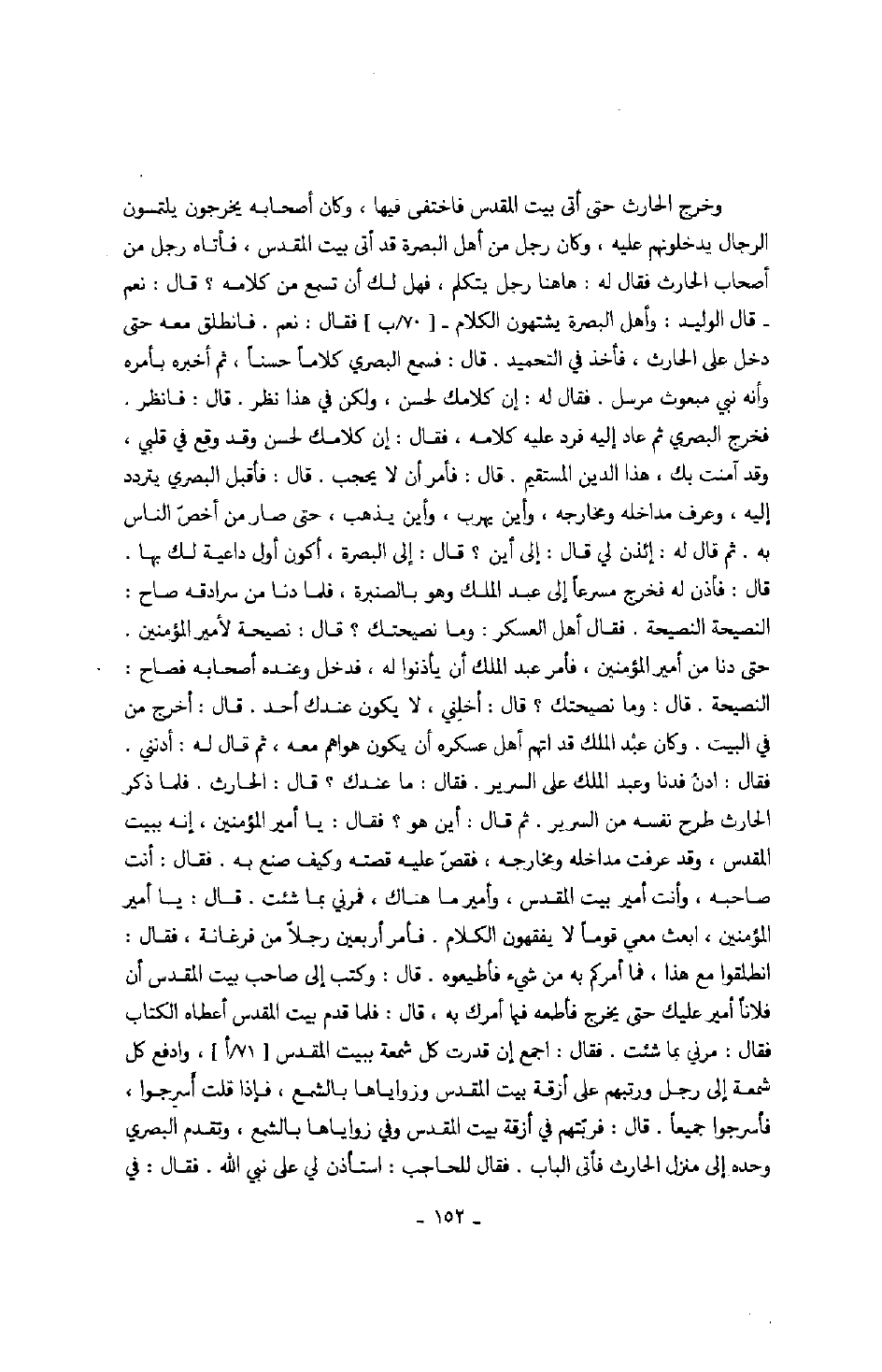 وخرج الحارث حتى أتى بيت المقدس فاختفى فيها، وكان أصحابه يخرجون يلتمسون الرجال يدخلونهم عليه، وكان رجل من أهل البصرة قد أتى بيت المقدس، فأتاه رجل من أصحاب الحارث فقال له: هاهنا رجل يتكلم، فهل لك أن تسمع من كلامه؟ قال: نعم - قال الوليد: وأهل البصرة يشتهون الكلام - فقال: نعم. فانطلق معه حتى على الحارث، فأخذ في التحميد. قال: فسمع البصري كلاماً حسناً، ثم أخبره بأمره وأنه نبي مبعوث مرسل. فقال له: إن كلامك لحسن، ولكن في هذا نظر. قال: فانظر. فخرج البصري ثم عاد إليه فرد عليه كلامه، فقال: إن كلامك لحسن وقد وقع في قلبي، وقد آمنت بك، هذا الدين المستقيم. قال: فأمر أن لا يحجب. قال: فأقبل البصري يتردد إليه، وعرف مداخله ومخارجه، وأين يهرب وأين يذهب، حتى صار من أخص الناس به. ثم قال له: إئذن لي قال: إلى أين؟ قال: إلى البصرة، أكون أول داعية لك بها. قال: فأذن له فخرج مسرعاً إلى عبد الملك وهو بالصنبرة، فلما دنا من سرادقه صاح: النصيحة النصيحة. فقال أهل العسكر: وما نصيحتك؟ قال: نصيحة لأمير المؤمنين. حتى دنا من أمير المؤمنين، فأمر عبد الملك أن يأذنوا له، فدخل وعنده أصحابه فصاح: النصيحة. قال: وما نصيحتك؟ قال: أخلني، لا يكون عندك أحد. قال: أخرج من في البيت. وكان عبد الملك قد اتهم أهل عسكره أن يكون هواهم معه، ثم قال له: أدنني. فقال: ادن فدنا وعبد الملك على السرير. فقال: ما عندك؟ قال: الحارث. فلما ذكر الحارث طرح نفسه من السرير. ثم قال: أين هو؟ فقال: يا أمير المؤمنين، إنه ببيت المقدس، وقد عرفت مداخله ومخارجه، فقص عليه قصته وكيف صنع به. فقال: أنت صاحبه، وأنت أمير بيت المقدس، وأمير ما هناك، فمرني بما شئت. قال: يا أمير المؤمنين، ابعث معي قوماً لا يفقهون الكلام. فأمر أربعين رجلاً من فرغانة، فقال: انطلقوا مع هذا، فما أمركم به من شيء فأطيعوه. قال: وكتب إلى صاحب بيت المقدس أن فلاناً أمير عليك حتى يخرج فأطعه فيما أمرك به، قال: فلما قدم بيت المقدس أعطاه الكتاب فقال: مرني بما شئت. فقال: اجمع إن قدرت كل شمعة ببيت المقدس، وادفع كل شمعة إلى رجل ورتبهم على أزقة بيت المقدس وزواياها بالشمع، فإذا قلت أسرجوا، فأسرجوا جميعاً. قال: فرتبهم في أزقة بيت المقدس وفي زواياها بالشمع، وتقدم البصري وحده إلى منزل الحارث فأتى الباب. فقال للحاجب: استأذن لي على نبي الله. فقال: في