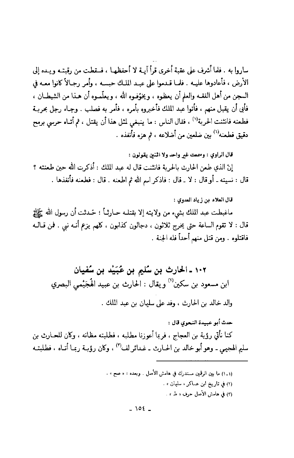 قال الراوي: وسمعت غير واحد ولا اثنين يقولون: إن الذي طعن الحارث بالحربة فانثنت قال له عبد الملك: أذكرت الله حين طعنته؟ قال: نسيته أو قال: لا - قال: فاذكر اسم الله ثم اطعنه. قال: فطعنه فأنفذها.
