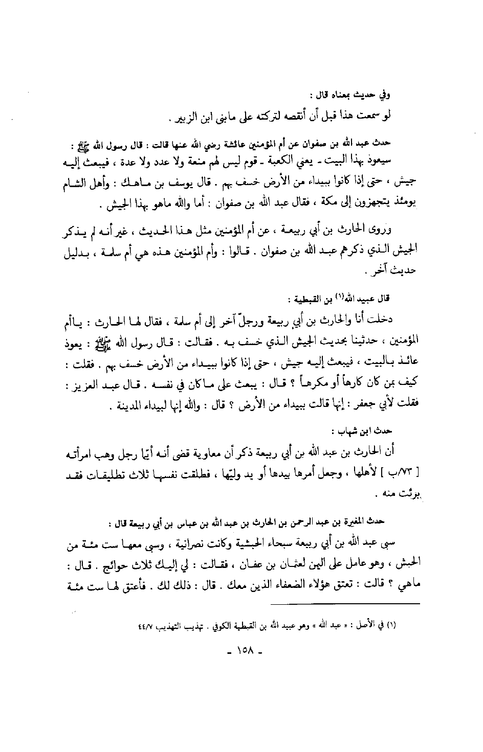 قال عبيد الله بن القبطية: دخلت أنا والحارث بن أبي ربيعة ورجل آخر إلى أم سلمة، فقال لها الحارث: يا أم المؤمنين، حدثينا بحديث الجيش الذي خسف به. فقالت: قال رسول صَلَّى اللهُ عَلَيْهِ وَسَلَّمَ: يعوذ عائذ بالبيت، فيبعث إليه جيش، حتى إذا كانوا ببيداء من الأرض خسف بهم. فقلت: كيف بمن كان كارهاً أو مكرهاً؟ قال: يبعث على ما كان في نفسه. قال عبد العزيز: فقلت لأبي جعفر: إنها قالت ببيداء من الأرض؟ قال: والله إنها لبيداء المدينة.