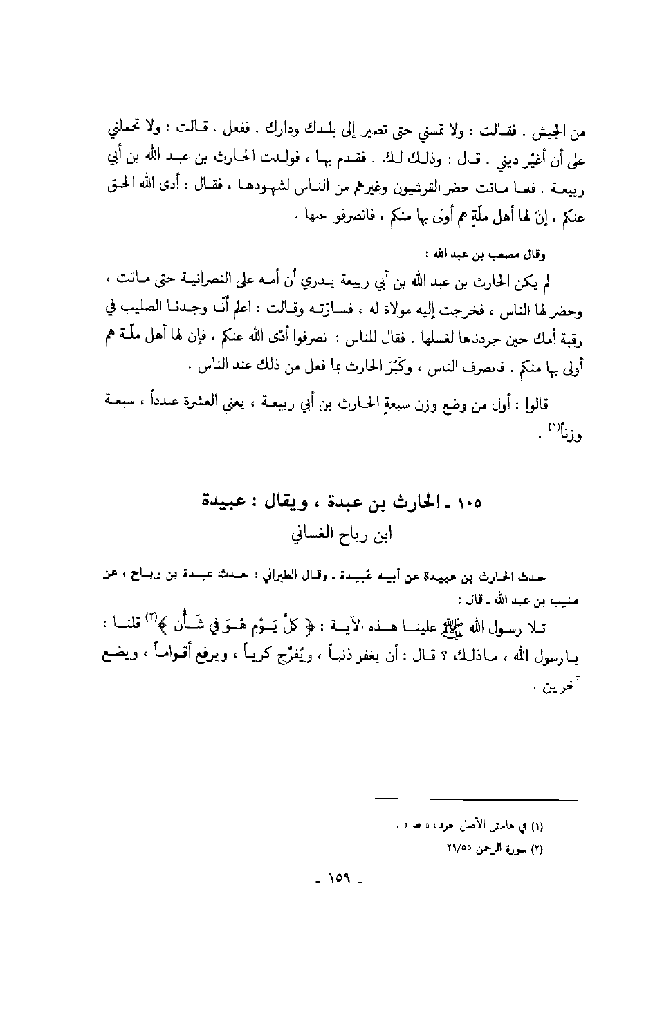 ويقال عبيدة بن رباح الغساني حدث الحارث بن عبيدة عن أبيه عبيدة - وقال الطبراني: حدث عبدة بن رباح، عن منيب بن عبد الله - قال: تلا رسول الله صَلَّى اللهُ عَلَيْهِ وَسَلَّمَ علينا هذه الآية: " كل يوم هو في شأن " قلنا: يا رسول الله، ما ذلك؟ قال: أن يغفر ذنباً، ويفرج كرباً، ويرفع أقواماً، ويضع آخرين.