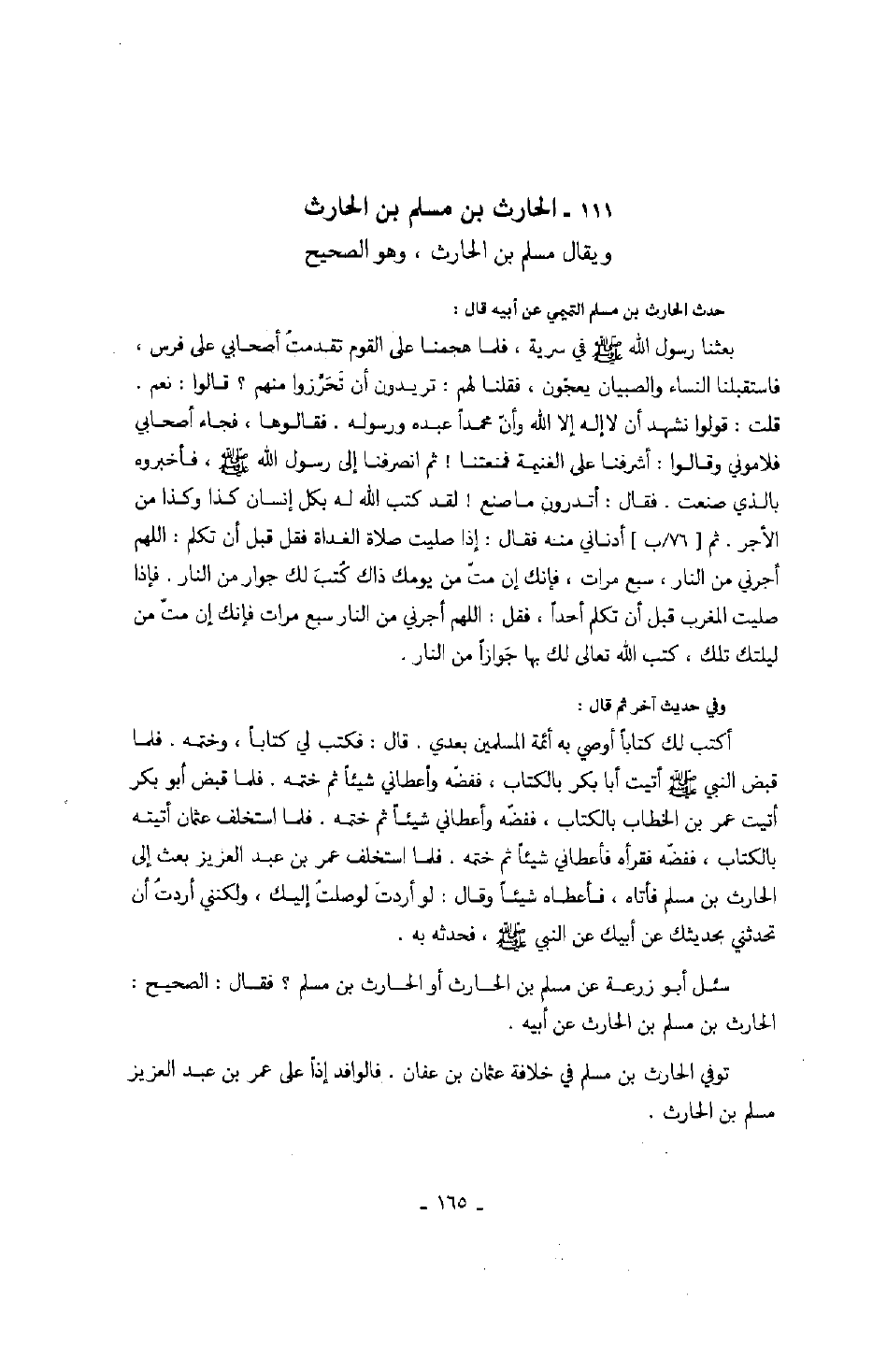 توفي الحارث بن مسلم في خلافة عثمان بن عفان. فالوافد إذاً على عمر بن عبد العزيز مسلم بن الحارث.